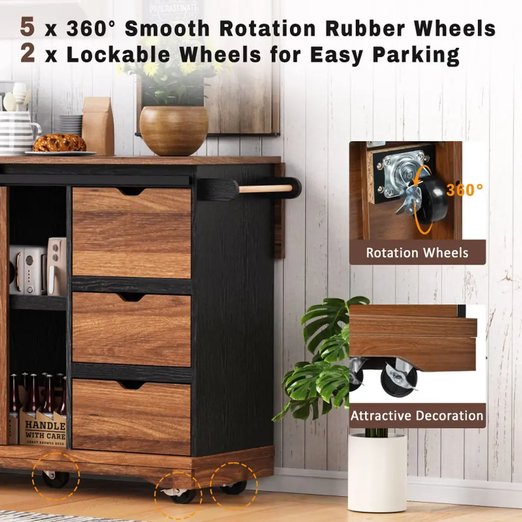 Jujabu 55.5" Farmhouse Kitchen Cart With Drop-leaf, Barn-door Storage, Built-in Outlet & Spice Rack On Wheels – Black