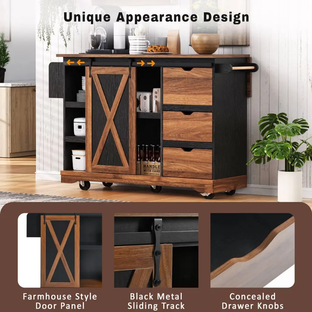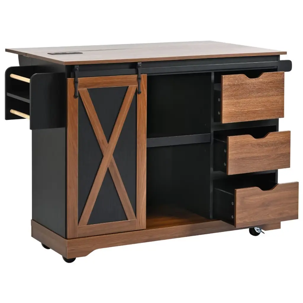 Bring rustic charm and practical functionality to your kitchen with this 55.5" farmhouse-style kitchen island featuring a classic sliding barn door and warm wood-grain finish. Designed for both beauty and utility, it offers ample storage with 3 drawers, adjustable shelves, a spice rack, and towel bar—perfect for keeping essentials organized. The built-in charging station includes 2 AC outlets, a USB port, and a Type-C port for powering appliances right on the countertop. A drop-leaf design expands workspace when needed and folds down to save space. With smooth-rolling wheels (2 lockable) and a sturdy, water-resistant P2 particleboard frame that supports up to 400 lbs, this island is as durable as it is stylish. Assembly is simple with labeled parts and step-by-step instructions included.