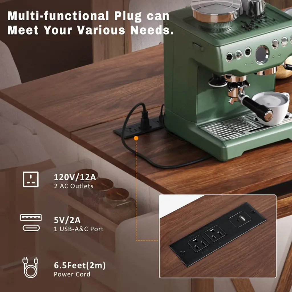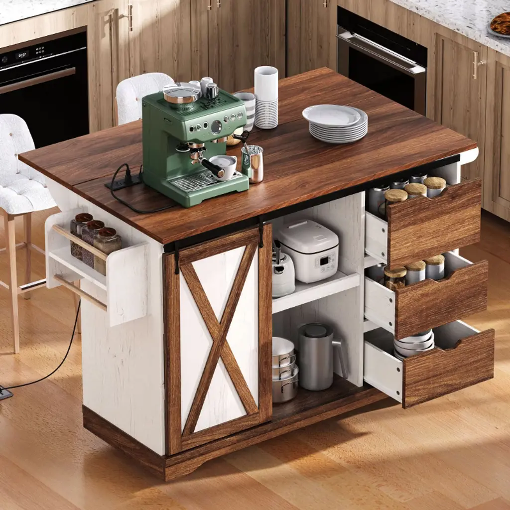 Bring rustic charm and practical functionality to your kitchen with this 55.5" farmhouse-style kitchen island featuring a classic sliding barn door and warm wood-grain finish. Designed for both beauty and utility, it offers ample storage with 3 drawers, adjustable shelves, a spice rack, and towel bar—perfect for keeping essentials organized. The built-in charging station includes 2 AC outlets, a USB port, and a Type-C port for powering appliances right on the countertop. A drop-leaf design expands workspace when needed and folds down to save space. With smooth-rolling wheels (2 lockable) and a sturdy, water-resistant P2 particleboard frame that supports up to 400 lbs, this island is as durable as it is stylish. Assembly is simple with labeled parts and step-by-step instructions included.