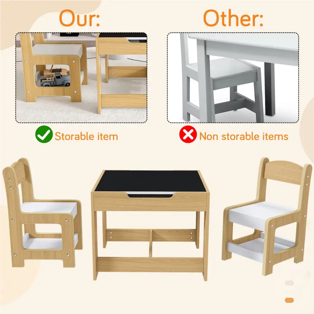 This 3-in-1 Kids Activity Table Set is designed to inspire creativity, learning, and play—all in one compact unit. Featuring a reversible tabletop with a chalkboard on one side and a whiteboard on the other, it easily converts into a building block station or snack table with its detachable top. Made from durable, child-safe engineered wood with smooth, rounded edges, this set is ideal for arts and crafts, reading, eating, or imaginative play. Built-in storage under the tabletop and on the chairs helps keep toys and supplies organized, making cleanup quick and simple. The set is perfectly sized for toddlers and young children and suitable for use in bedrooms, playrooms, nurseries, or classrooms. Quick to assemble and easy to clean, this all-in-one furniture set grows with your child’s needs.