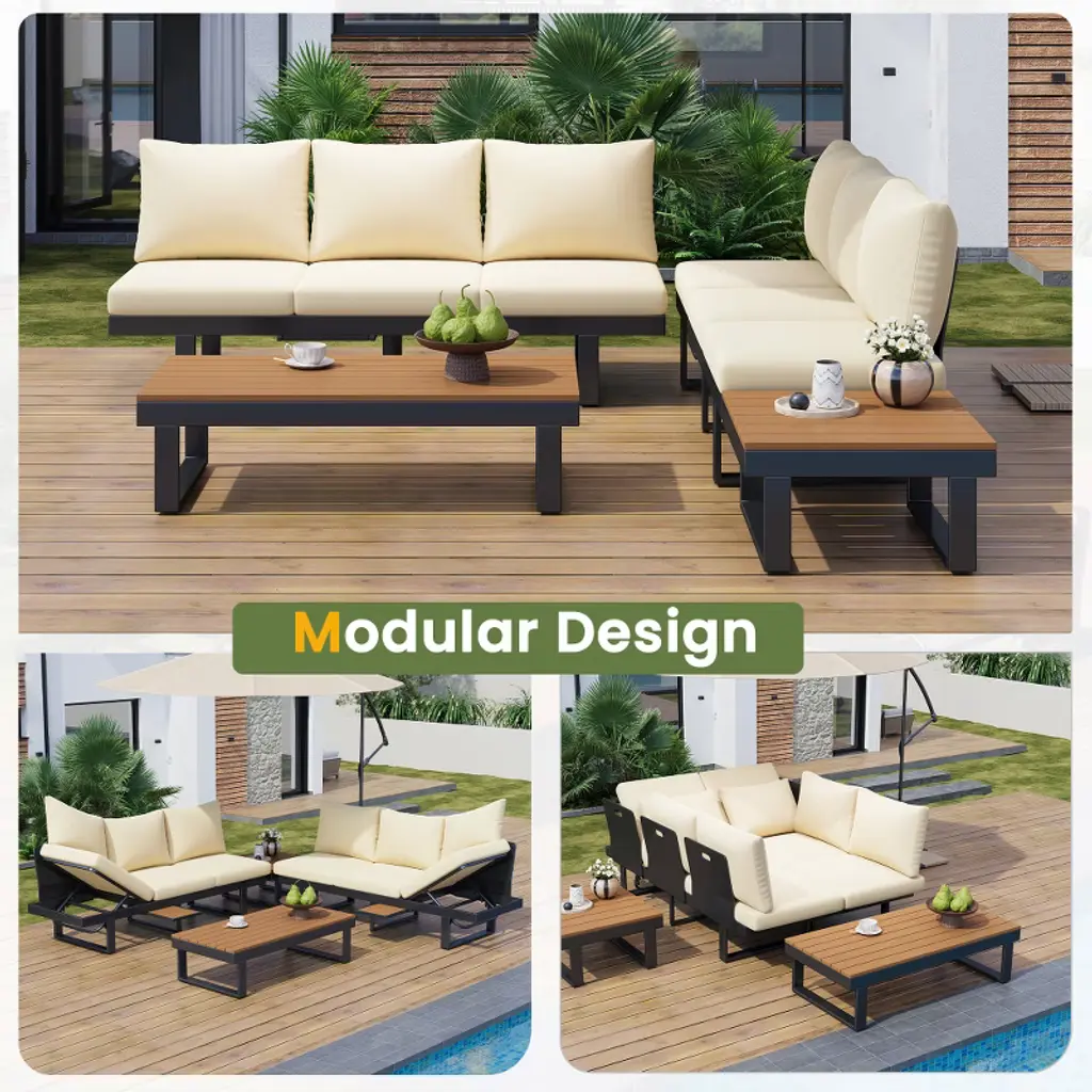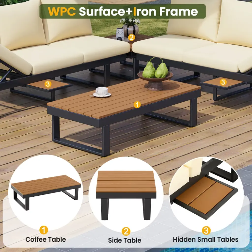 This versatile outdoor sofa set offers ultimate comfort with adjustable seats featuring five reclining positions. Its modular design allows easy configuration between L-shape or straight-line layouts, fitting various outdoor spaces. Crafted with a durable iron frame and weather-resistant WPC surfaces, it ensures long-lasting use. The set includes high-density sponge cushions with water-resistant fabric covers for added comfort and easy maintenance. Featuring a spacious coffee table, a multifunctional small table, and hidden pull-out side tables, it provides convenient storage and surface space. Perfect for patios, gardens, or outdoor lounges, this set combines style, comfort, and practicality.