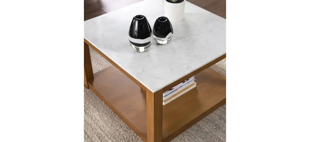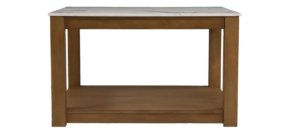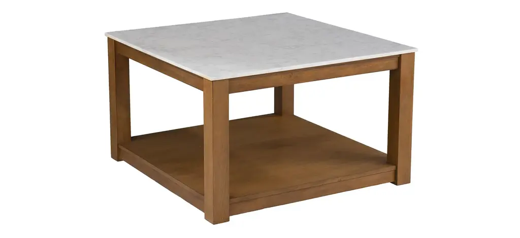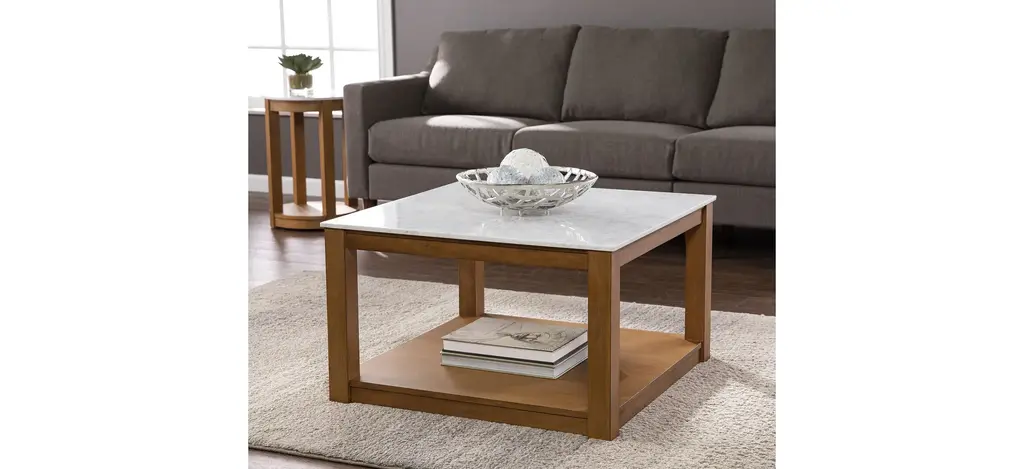 Julianna Square Cocktail Table bring sophisticated simplicity into your home with this two-tone coffee table. A spacious tabletop holds magazines and d_cor items, while the open wood shelf stores board games and extra blankets. The natural finished base crafts a classic look, complementing most d_cor. Entertain in elegant style when your place this faux marble top cocktail table in your living room or open concept living space.