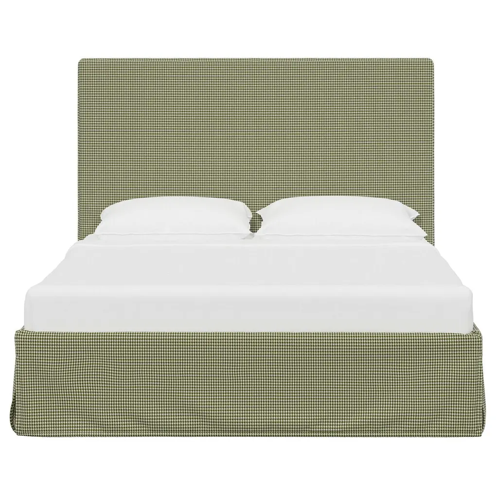 With its elegant simplicity, this bed frame boasts clean lines and a tall headboard, commanding attention in any room. The tailored slipcover is removable and featured in a stunning woven houndstooth fabric. A high padded headboard is ideal for resting against when reading or watching TV. Combining practicality with style, this slipcover bed is perfect for adding a signature touch to your space. Handcrafted in the USA, mattress and box spring required (suggested box spring height is 9”).