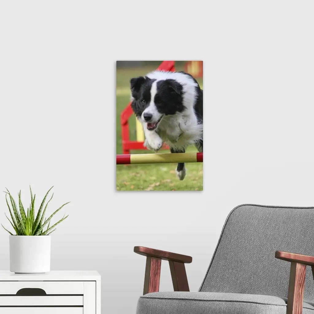 Jumping border collie during trial wall art for home and office decor. Discover canvas art prints, photos, mural, big canvas art and framed wall art in GreatBigCanvas.com's varied collections.