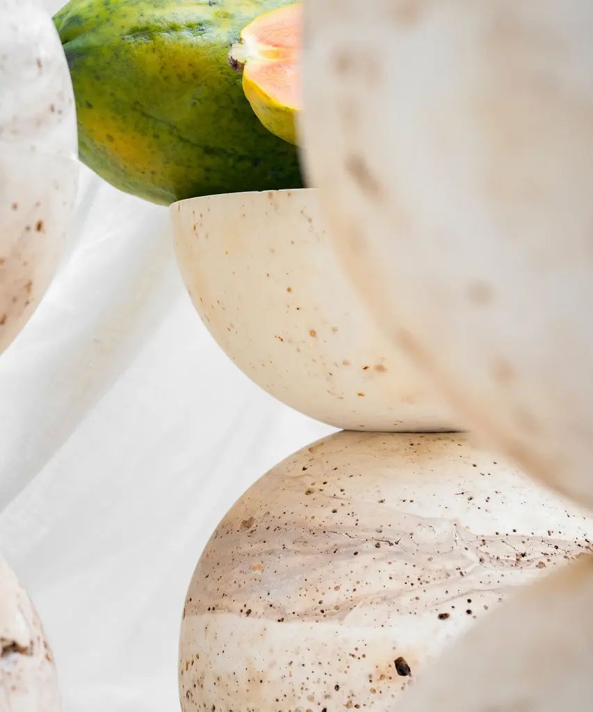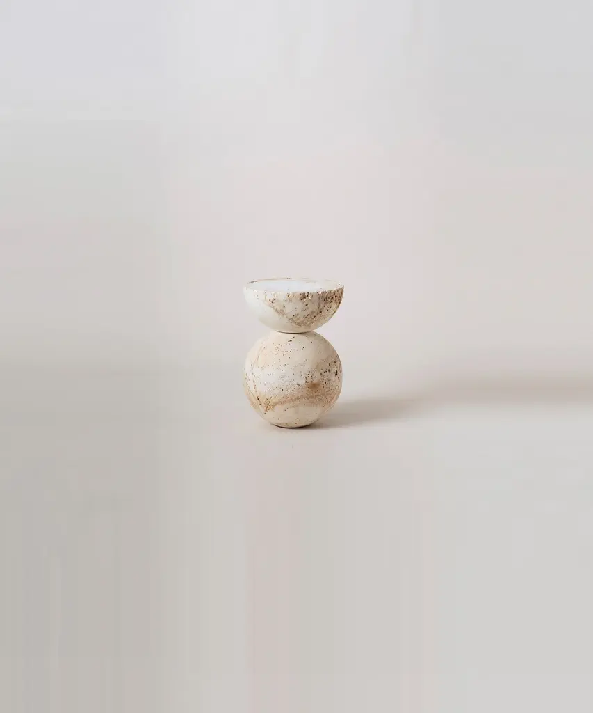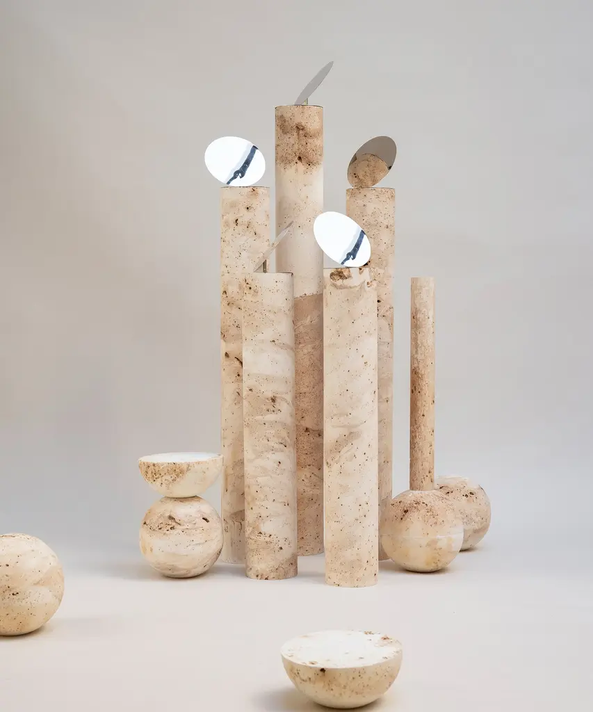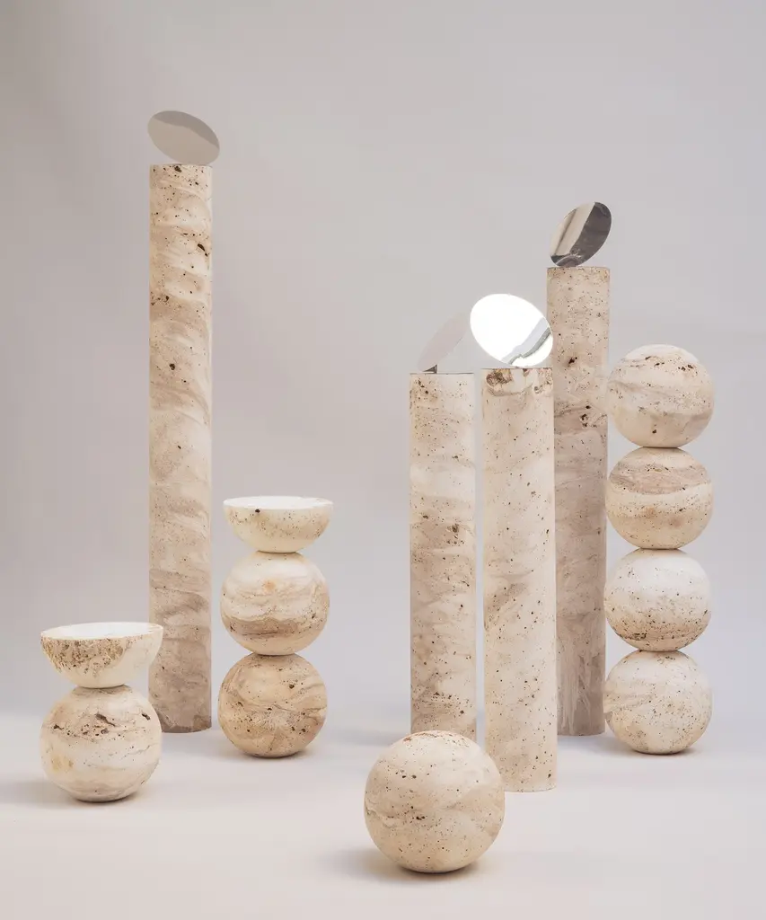 Jupiter's project arises from the idea of the stone as a symbol of sacredness. The relationship between stones and the sacred has been consistent since man inhabited the earth. This is how Litholatry or the worship of stones comes about. Their positioning in a chosen place grants them sacralization, transforming the space into a place of worship where the union between the heavenly and earthly worlds. (Omphalos) It’s based on one of the most primitive, natural, and intuitive gestures of the human being: lining up stones on a mound. These ancient constructions, present in all cultures have been employed as physical and spiritual reference points. Jupiter is a modular piece composed of spheres and semi-spheres stacked together in multiple combinations.