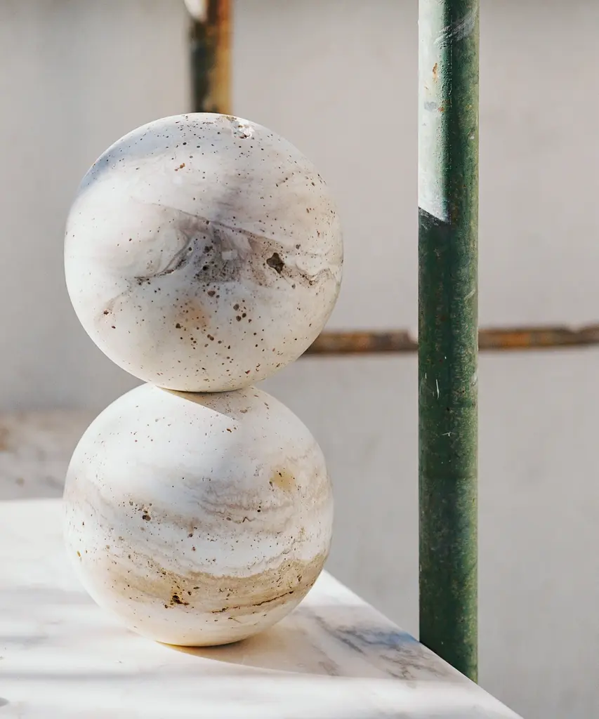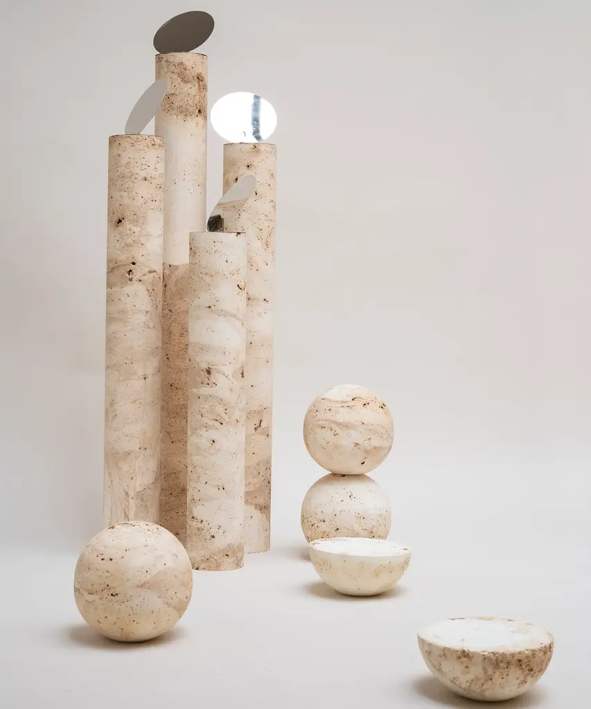 Jupiter's project arises from the idea of the stone as a symbol of sacredness. The relationship between stones and the sacred has been consistent since man inhabited the earth. This is how Litholatry or the worship of stones comes about. Their positioning in a chosen place grants them sacralization, transforming the space into a place of worship where the union between the heavenly and earthly worlds. (Omphalos) It’s based on one of the most primitive, natural, and intuitive gestures of the human being: lining up stones on a mound. These ancient constructions, present in all cultures have been employed as physical and spiritual reference points. Jupiter is a modular piece composed of spheres and semi-spheres stacked together in multiple combinations.