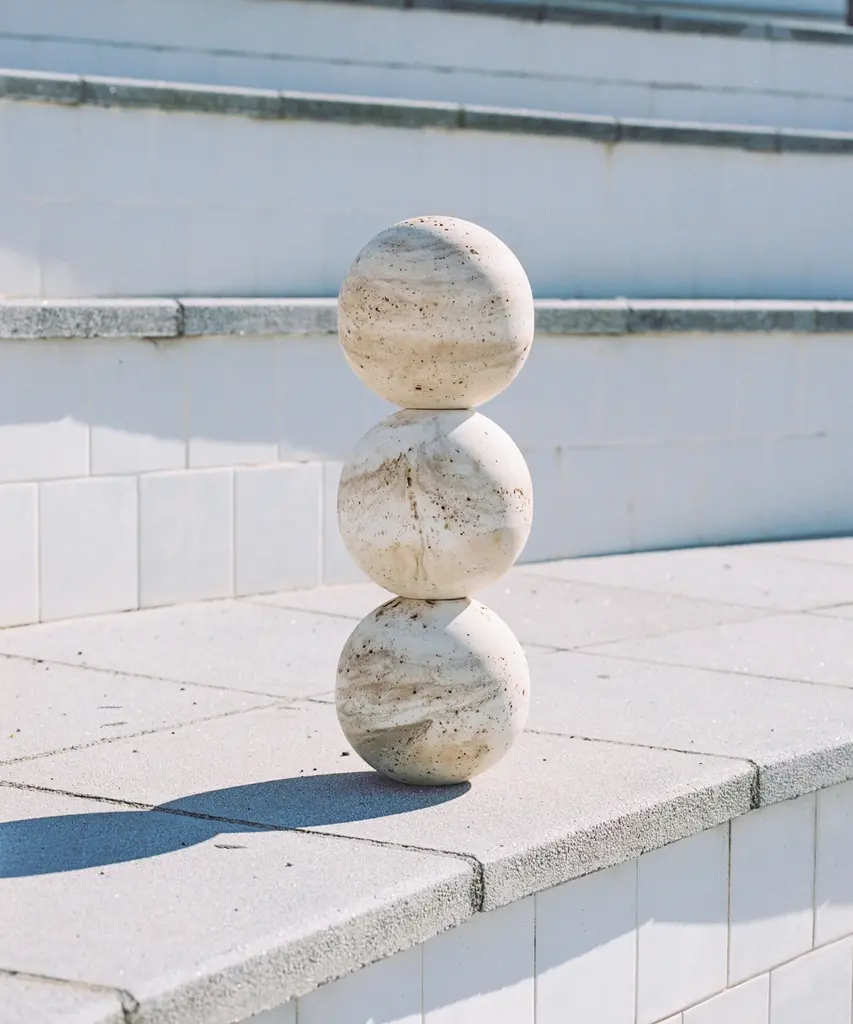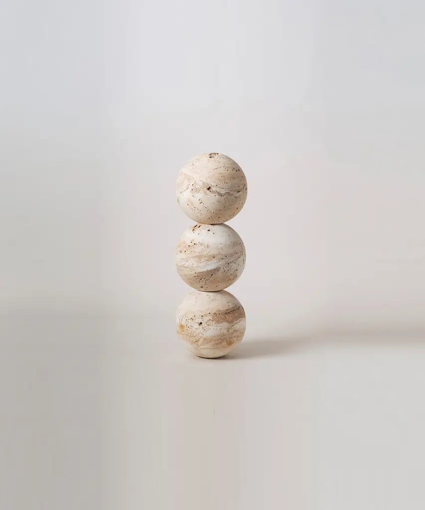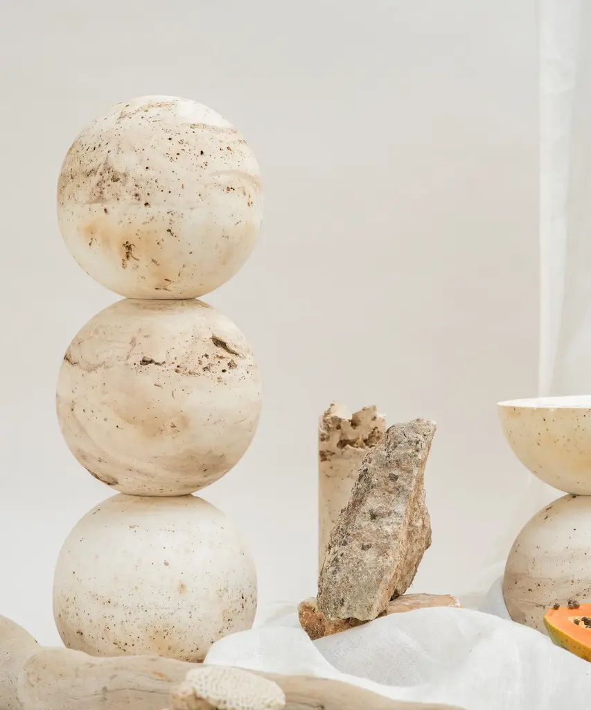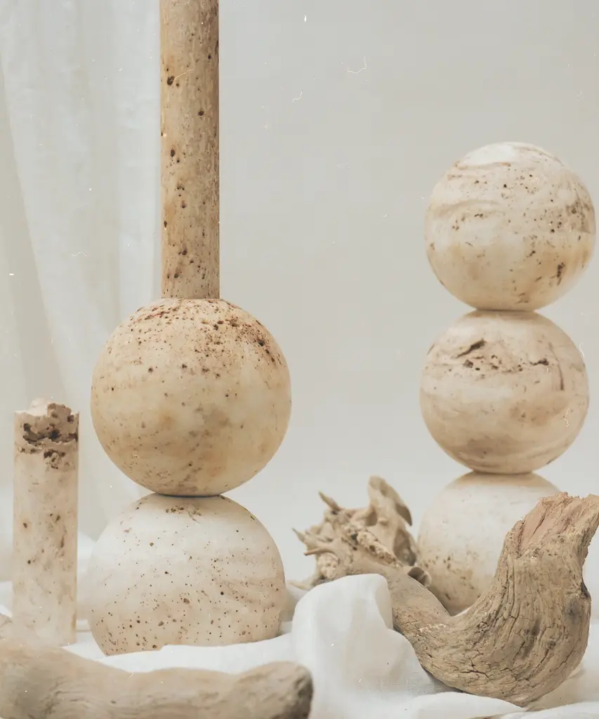 Jupiter's project arises from the idea of the stone as a symbol of sacredness. The relationship between stones and the sacred has been consistent since man inhabited the earth. This is how Litholatry or the worship of stones comes about. Their positioning in a chosen place grants them sacralization, transforming the space into a place of worship where the union between the heavenly and earthly worlds. (Omphalos) It’s based on one of the most primitive, natural, and intuitive gestures of the human being: lining up stones on a mound. These ancient constructions, present in all cultures have been employed as physical and spiritual reference points. Jupiter is a modular piece composed of spheres and semi-spheres stacked together in multiple combinations.