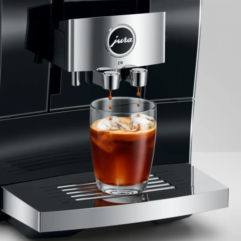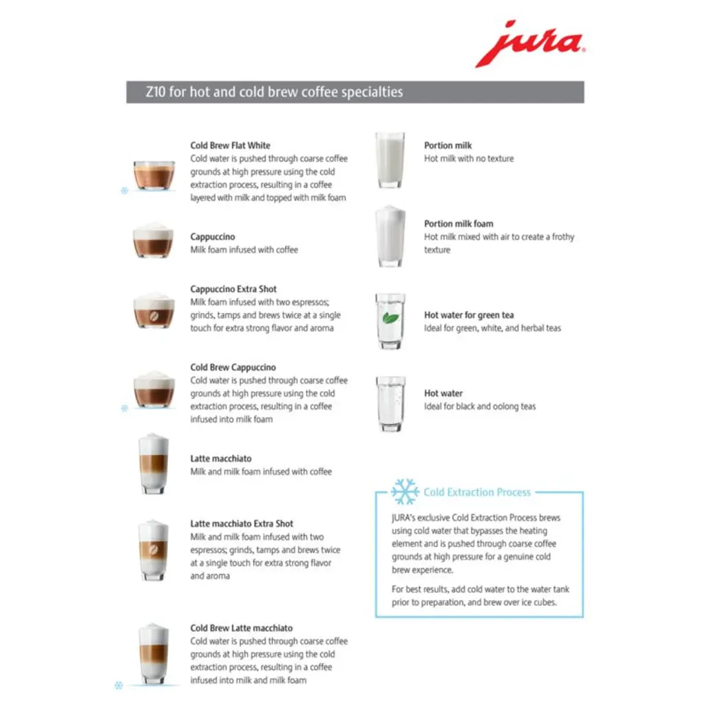 Inspired by the world's best baristas, the JURA Z10 brews 40 beverage options at the touch of a button. The burr grinder automatically adjusts to the drink choice with the right grind, while the 3-D brewing technology maximizes aroma. The innovative Cold Extraction process uses high-pressure cold water to extract the most flavor for cold-brew drinks. Choose from hot or cold cortado, latte, macchiato, flat white, cappuccino, doppio, Americano and other coffee drinks made to barista standards. Easy to maintain, the espresso machine boasts a one-touch milk system cleaning and integrated rinsing, cleaning and descaling programs. Equally impressive to look at, the black Z10 features an attractive wave design on the water tank and a curved aluminum front panel.Based in Switzerland, JURA has been creating inventive, high-end appliances since 1931 and has specialized in coffee and espresso machines since the 1980s. JURA brings sophistication, quality, versatility and ease of use to brewing espresso-based beverages at home.Need help choosing? View our JURA comparison chart.