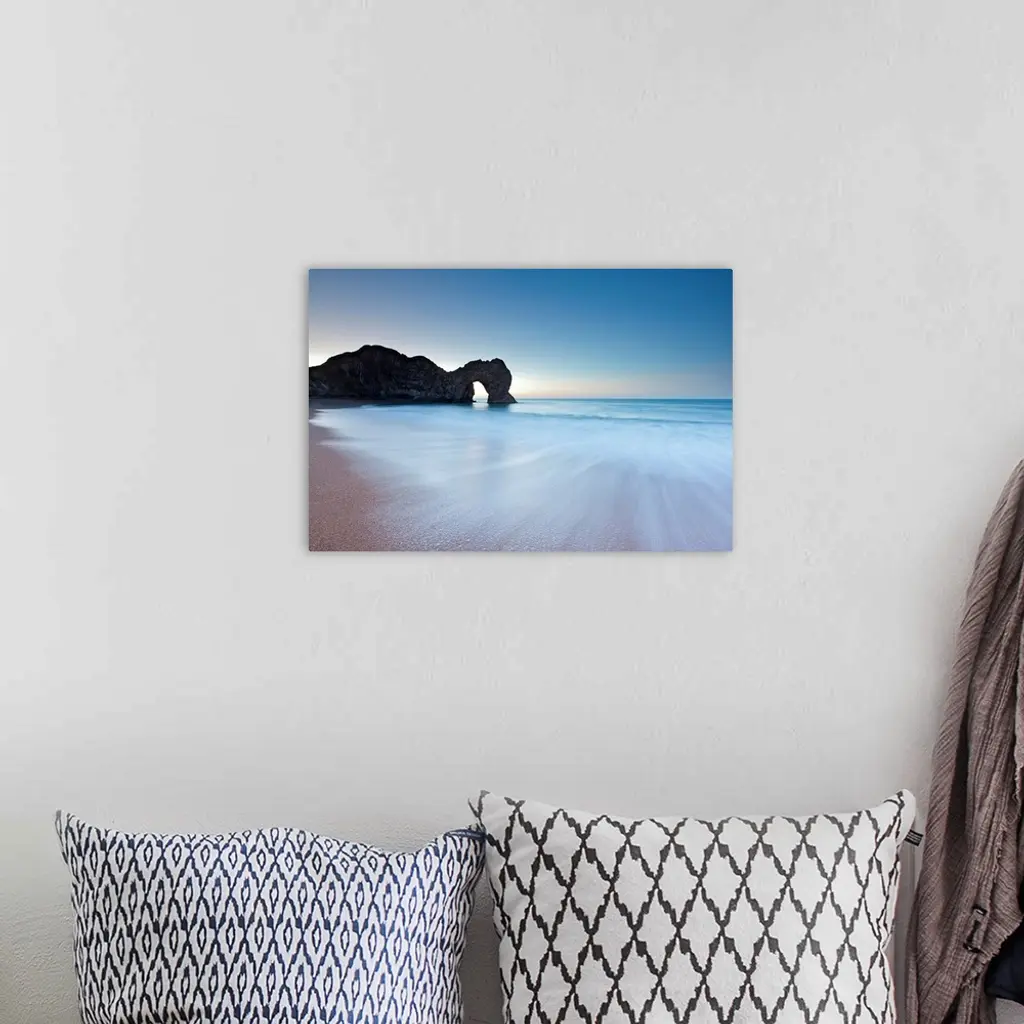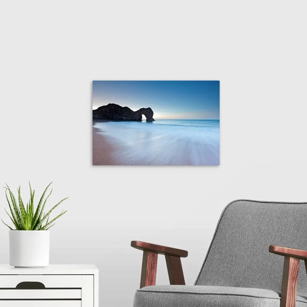 Durdle Door rock arch on the Dorset coast at sunrise with a blue sky and swooshing waves in minimalist energy.