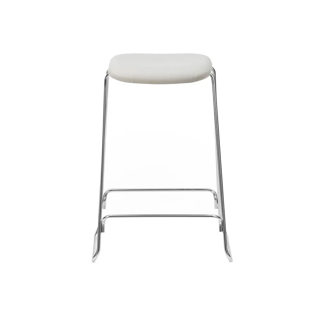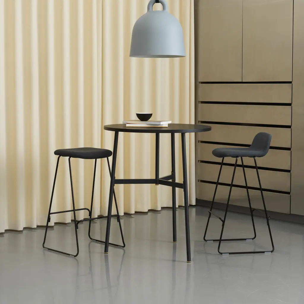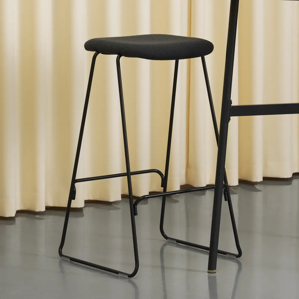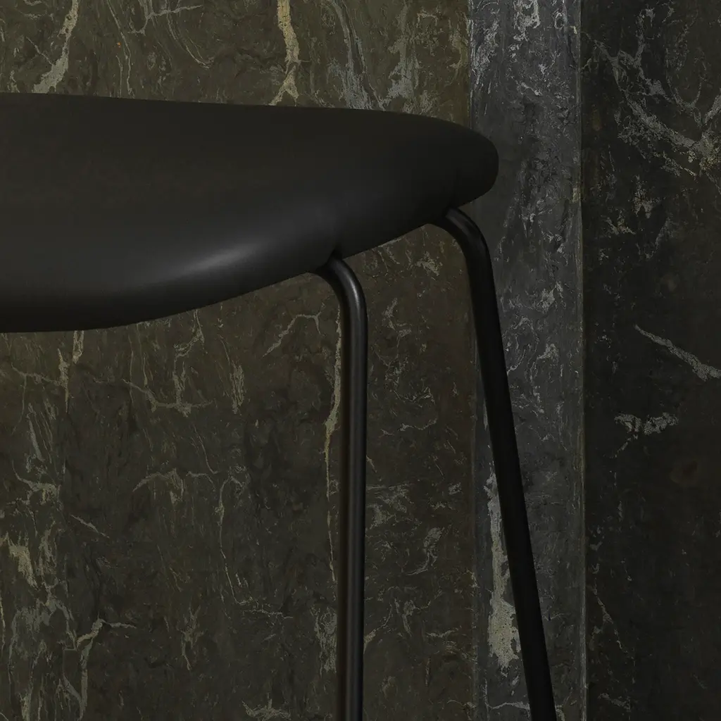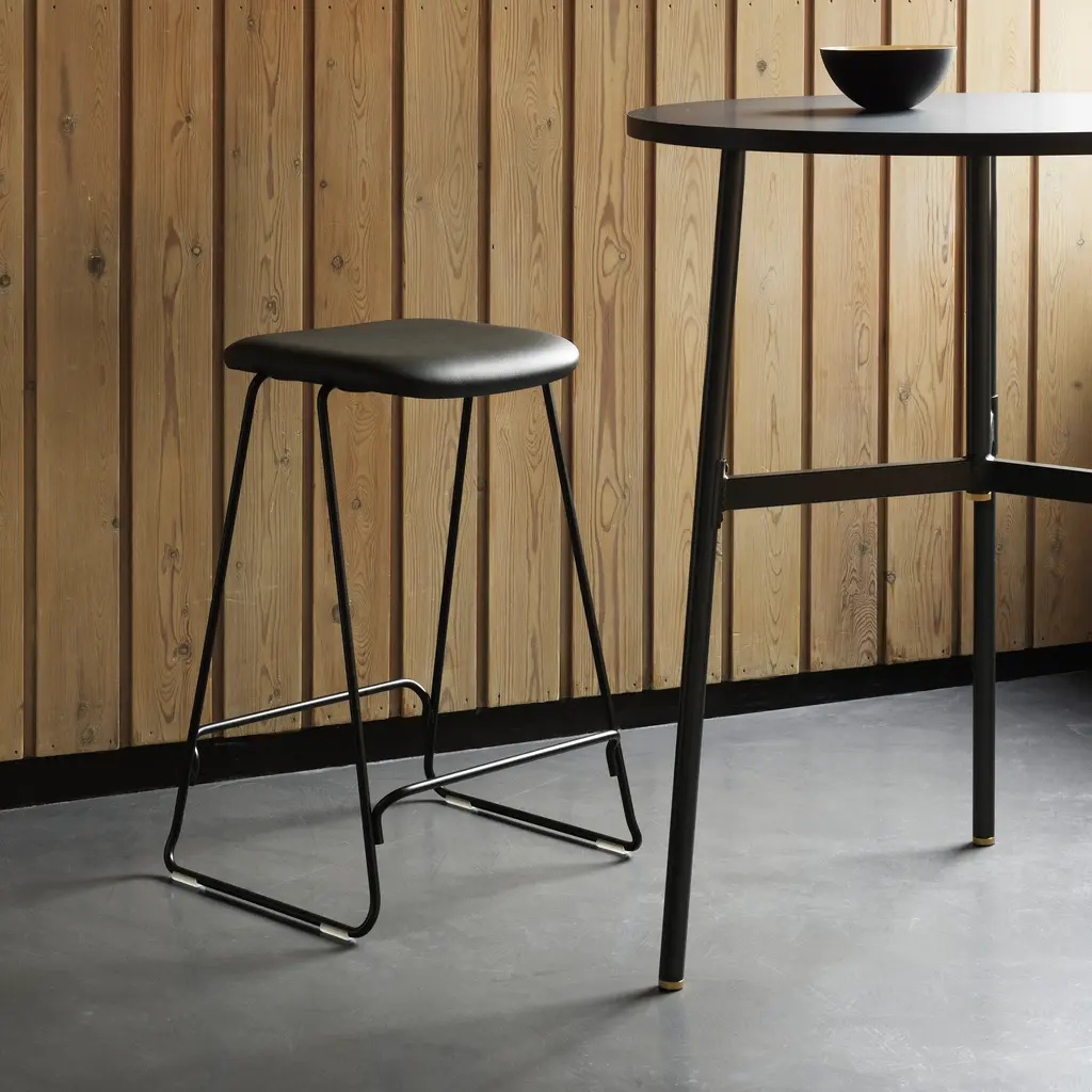 With both bar or counter versions, Normann Copenhagen ups the ante on its Just molded stool with cushioning clad in a custom choice of elevated fabric or leather. Iskos-Berlin’s sleek seating melds ergonomic comfort with appealing contours that originate with a shell made of molded ash veneer and covered with PU foam before the final upholstery. A discreetly integrated sledge base with footrest in chrome-finish or blackened steel completes the picture.