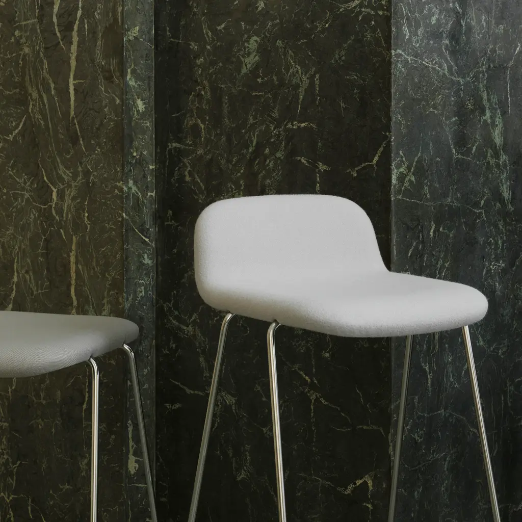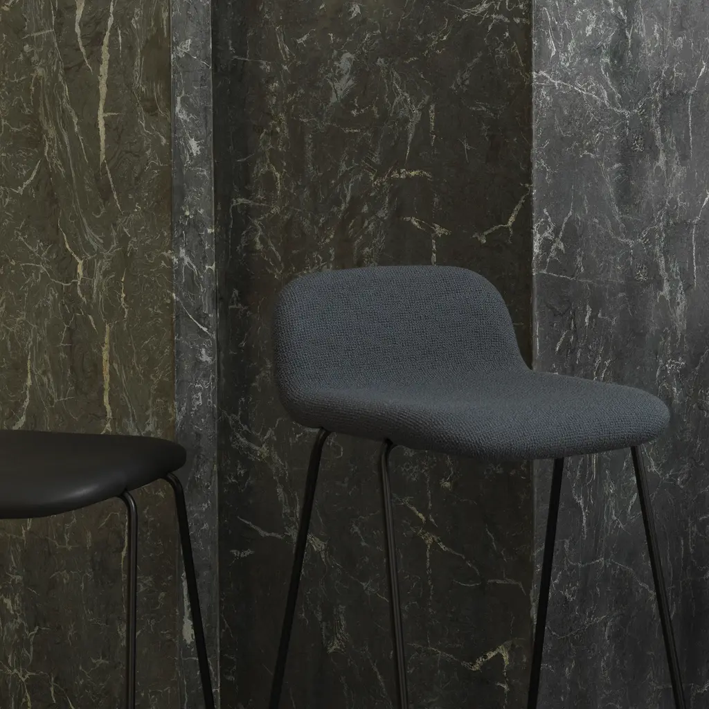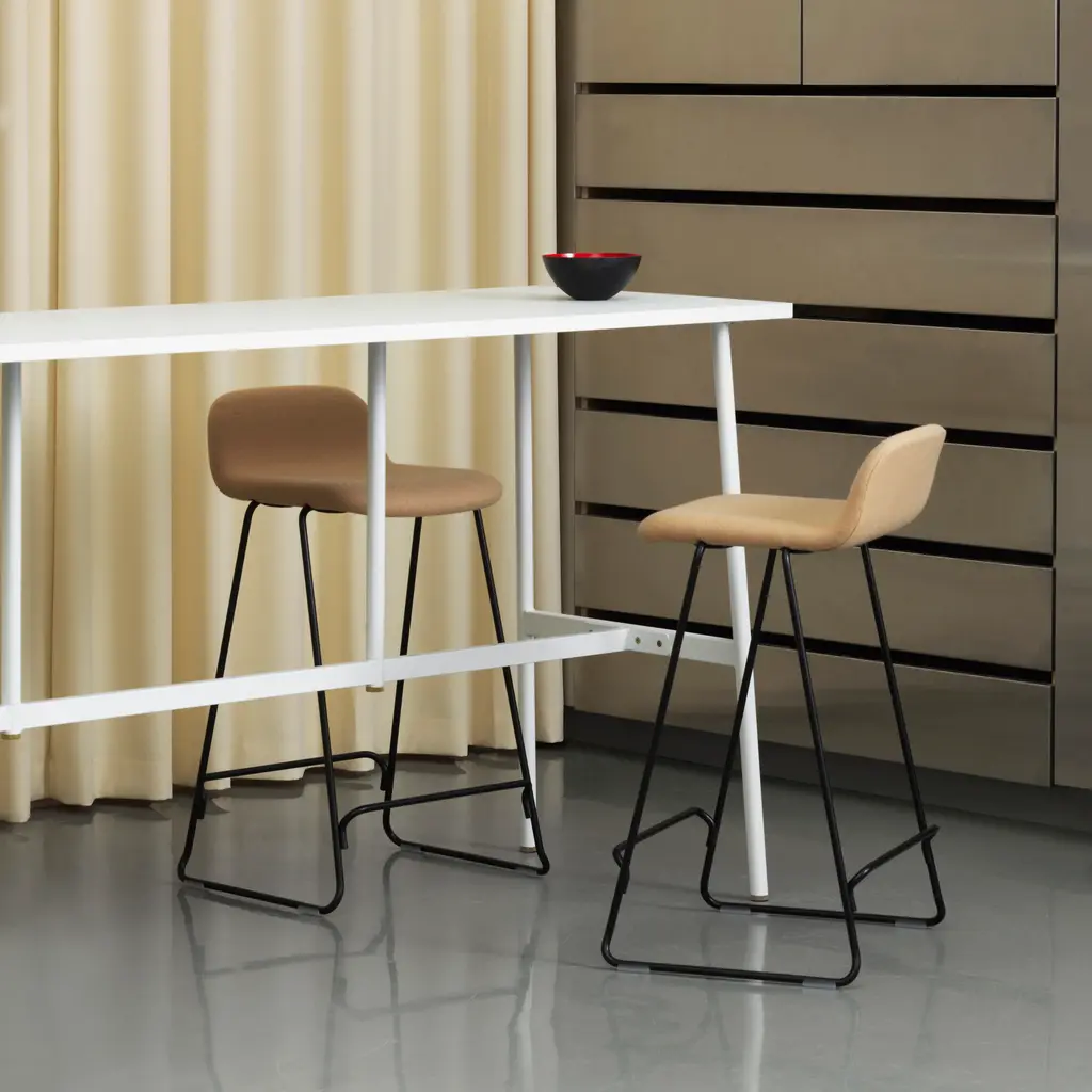 In a choice of bar or counter stool, design duo Iskos-Berlin bring the luxuriously customizing option of upholstery to their signature shell seating. Just’s sleek contours originate with a shell made of molded ash veneer, covered with PU foam and then clad in a fine textile or leather. The angular but airy base in black or chromed steel is discretely integrated with the molded shell to extend its suitability for numerous environments.