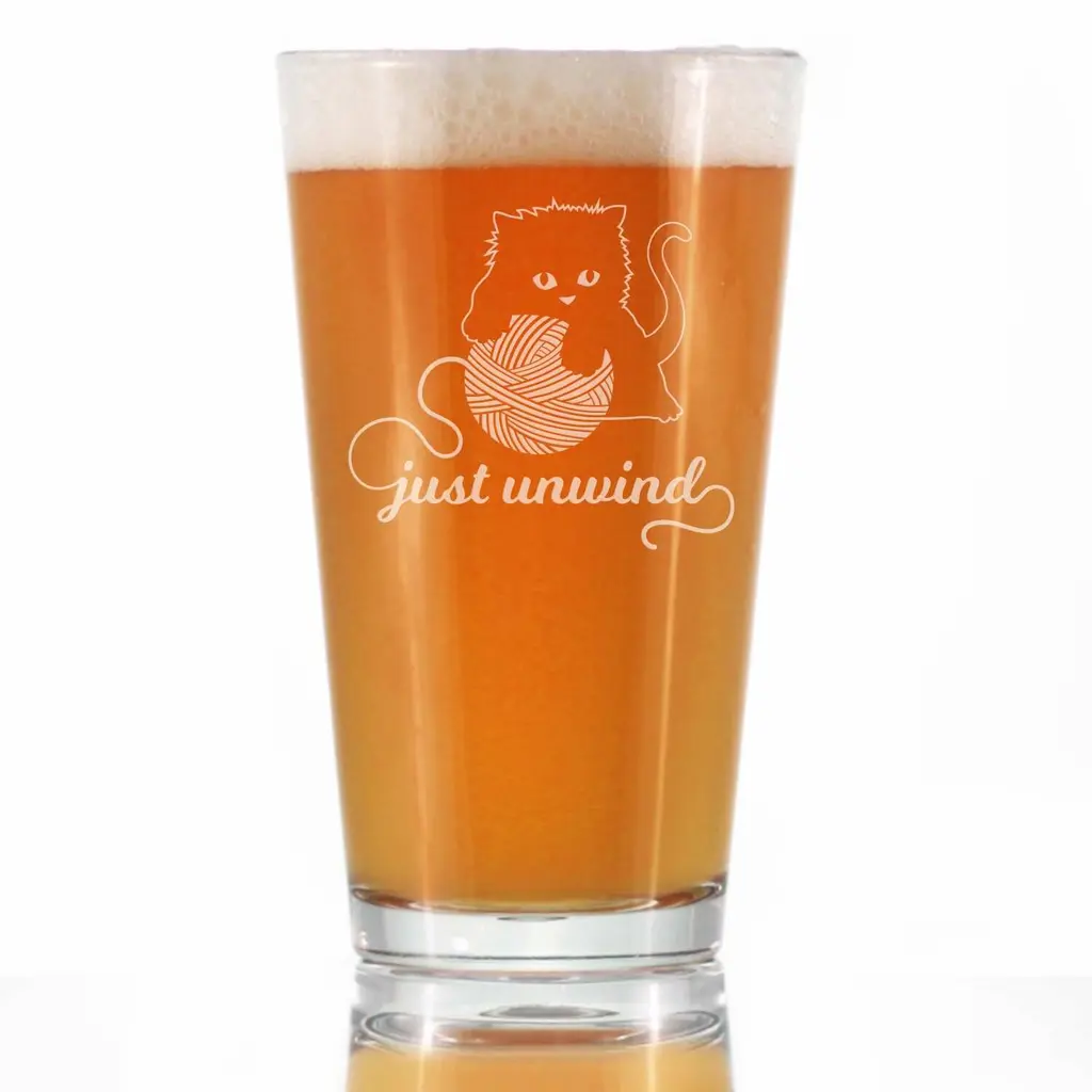 Just Unwind - Beer Pint Glass - Cat & Knitting Gifts - 16 Ounce - Clear