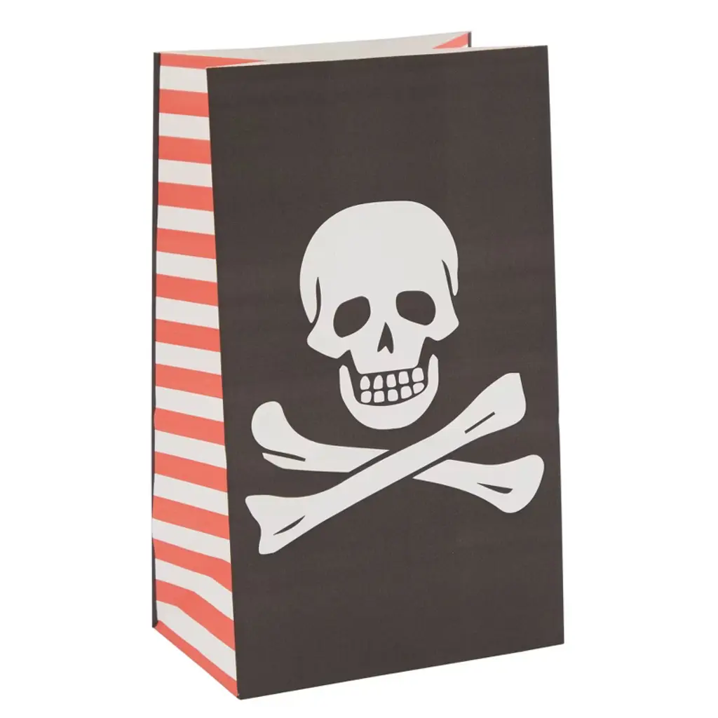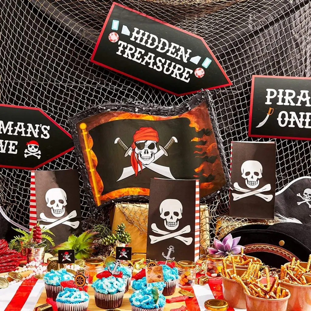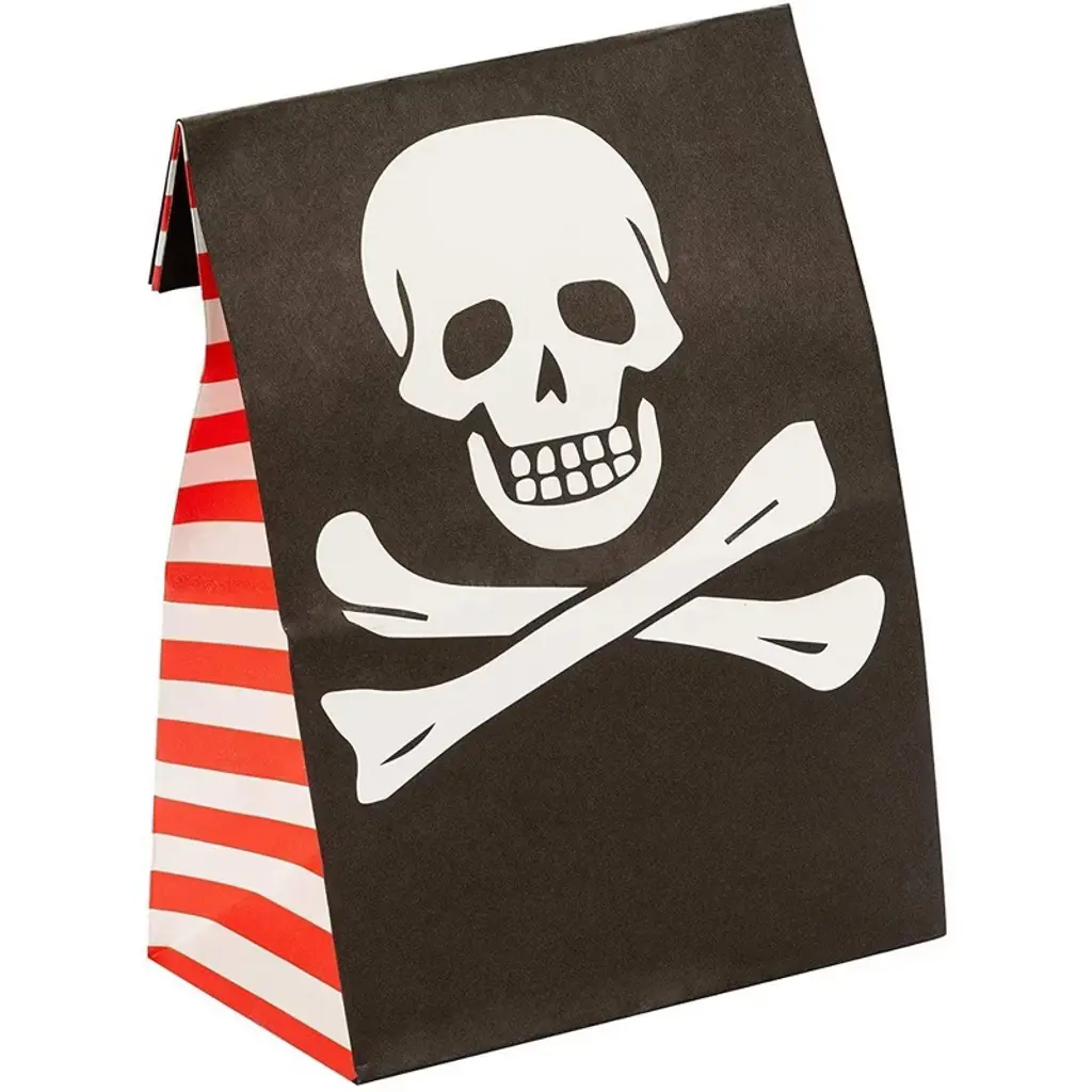 Experience a fun-filled celebration with these Pirate Party Bags for kids, perfect for both birthday parties and Halloween events. These pirate treat bags feature a bold skull and crossbones design in black, complemented by striking red and white stripes on the sides. Made from thick paper, these pirate goodie bags are durable and won’t easily rip with use, making them the perfect choice for all your party needs. Each of these skeleton goodie bags has a flat, reinforced bottom, designed to hold all the pirate-themed goodies you've prepared. Fill them up with gold coins, pirate flags, play gems, pirate toys, and other small gifts without worrying about them tearing or tipping over. Measuring approximately 5 inches wide, 8.7 inches high, and with a 3.2-inch gusset, these pirate bags for party favors are spacious enough to hold a variety of treats and toys. With 36 pieces included in this set, you'll have plenty of pirate gift bags for all your guests. Perfect for pirate-themed events, these pirate goodie bags favors are a treasure for any celebration!