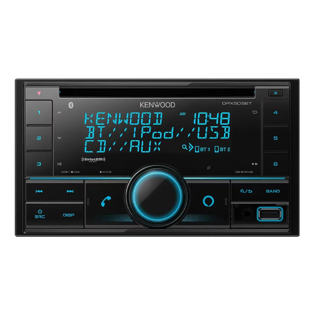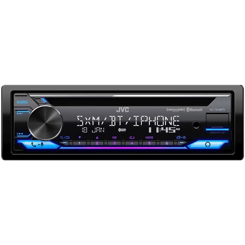 JVC KD-T910BTS - CD Receiver featuring Bluetooth, Front USB, AUX, Amazon Alexa, SirusXM Ready (Requires Tuner) • Amazon Alexa Compatible • 2-Zone Variable Color Illumination • Ready for SiriusXM Radio - (Optional SiriusXM Tuner Required, Sold Separately) • Bluetooth Wireless Technology (Wired-Mic Included) • Bluetooth Hands-Free Profile 1.7 • Audio Streaming & Control (A2DP, AVRCP) • JVC Streaming DJ (5 BT-Audio Connection) • Voice Recognition Dialing • 2 Phones Full-Time Connection • Phone Book Access Profile (PBAP) • iPhone® Bluetooth Automatic Pairing • Pandora / Spotify Control (Android/iPhone) • Front USB Input with up to 1.5A Charging • Front AUX Input • iPod/iPhone Control (Check Manual for Compatibility) • Android Music Playback (via Bluetooth) • FLAC Playback 96kHz/24bit (USB) • MP3,WMA (CD/USB) WAV,AAC Compatible (USB) • 13-Band Graphic EQ with 11 Preset EQ Settings • Time Alignment - Space Enhancement - Sound Lift • K2 Technology for Enhanced Digital Sound Quality • Loudness Control (Off/Low/High) + Bass Boost Control • 2 Pairs 2.5V Pre-Outs - (Front + Rear/Subwoofer Selectable) • High-Pass + Low-Pass Filter • Subwoofer Level Control (Level -50 to +10) • MOS-FET 50W x 4 Power Output (22W RMS x 4) • 2-Line VA (Vertical Alignment) LCD Display • Music Sync Illumination Effect • Low Battery (Bluetooth Device) Information • Selectable Spectrum Analyzer or Clock on all Sources • Spanish Text Display Compatible • French Text Display Compatible (Canadian French) • Detachable Face Panel • Steering Wheel Remote Ready • Optional Wireless Remote Control (RM-RK52) • Remote Control App Ready - iPhone and Android