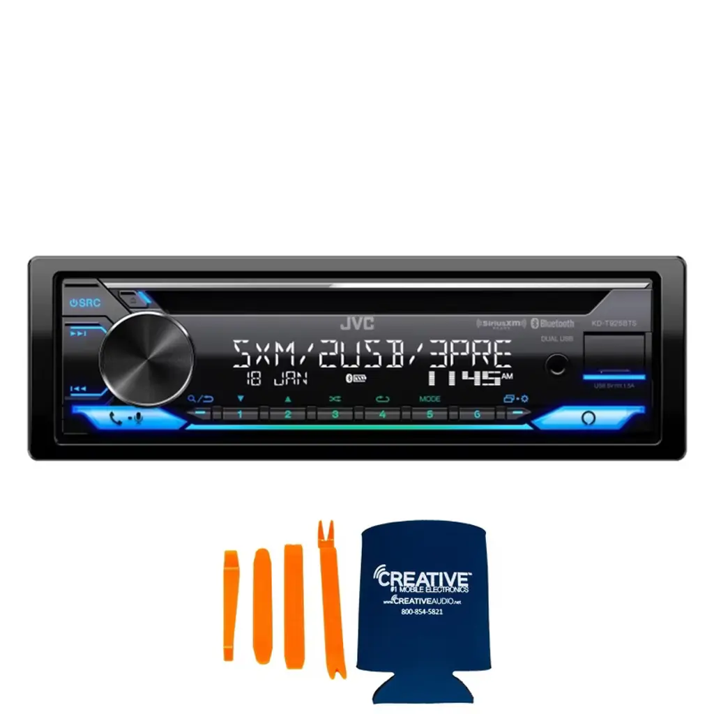 JVC KD-T925BTS CD Receiver featuring Bluetooth®, Front & Rear Dual USB, Sirius XM, Amazon Alexa, 13-Band EQ, with SXV300v1 Satellite Radio Tuner and PAC SWI-CP2 Steering Wheel Interface - This bundle includes: JVC KD-T925BTS CD Receiver featuring Bluetooth® / Front & Rear Dual USB / Sirius XM / Amazon Alexa / 13-Band EQ / Variable-Color Illumination /JVC Remote App Compatibility, PAC Audio SWI-CP2 Universal Analog/CAN-Bus Steering Wheel Control Interface, SiriusXM SXV300v1 Connect Vehicle Tuner Kit for Satellite Radio, a pry kit, and a Creative Audio coozy. JVC KD-T925BTS CD Receiver featuring Bluetooth® / Front & Rear Dual USB / Sirius XM / Amazon Alexa / 13-Band EQ / Variable-Color Illumination /JVC Remote App Compatibility Display Display Type: 2-Line VA LCD Display LCD Color: White Key Color: Variable Color Audio Maximum Power Output: 50W x 4 / 50W x 2 +Subwoofer (4 ohms) 50W x 1 Full Bandwidth Power (at less than 1%THD): 22W x 4 Subwoofer Direct Connection (Mono Lch): Yes EQ: Yes (13-Band Graphic EQ) SiriusXM SXV300v1 Connect Vehicle Tuner Kit for Satellite Radio • Connect, control and enjoy SiriusXM though the vehicle's in-dash audio system; no special translators or cable adapters are needed. • Compact size hides discreetly behind the dash for a fully integrated look. • Single interface cable connection to SiriusXM-Ready car stereo simplifies installation. • Pause, Rewind and Replay up to 60 minutes of live Satellite Radio.* • Automatically start songs from the beginning on your favorite channels with TuneStart™.* • Use TuneMix™ to hear a mix of songs from your favorite channel.* PAC Audio SWI-CP2 Universal Analog/CAN-Bus Steering Wheel Control Interface Easy to Use and Time Saving Works on Analog (resistive) and Data SWC Systems Button learning mode Customizable Button Functions Provides 2 Amp, 12V ACC Output (Data-bus applications)
