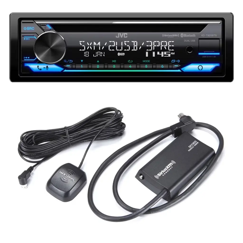 JVC KD-T925BTS CD Receiver featuring Bluetooth®, Front & Rear Dual USB, Sirius XM, Amazon Alexa, 13-Band EQ, Variable-Color Illumination, with PAC SWI-RC Steering Wheel Interface - This bundle includes: JVC KD-T925BTS CD Receiver featuring Bluetooth® / Front & Rear Dual USB / Sirius XM / Amazon Alexa / 13-Band EQ / Variable-Color Illumination /JVC Remote App Compatibility, PAC Audio SWI-RC Steering Wheel Control Interface for compatible radios, a pry kit, and a Creative Audio coozy. JVC KD-T925BTS CD Receiver featuring Bluetooth® / Front & Rear Dual USB / Sirius XM / Amazon Alexa / 13-Band EQ / Variable-Color Illumination /JVC Remote App Compatibility Display Display Type: 2-Line VA LCD Display LCD Color: White Key Color: Variable Color Inputs and Outputs AUX Input: 1 (Front) Line Output Terminals (Pair): 3 Pairs (Front + Rear + Subwoofer) Pre-Output Level: 5.0V Audio Maximum Power Output: 50W x 4 / 50W x 2 +Subwoofer (4 ohms) 50W x 1 Full Bandwidth Power (at less than 1%THD): 22W x 4 Subwoofer Direct Connection (Mono Lch): Yes EQ: Yes (13-Band Graphic EQ) PAC Audio SWI-RC Steering Wheel Control Interface for compatible radios Control functions such as volume, mode and track on most Pioneer, Sony, JVC, Alpine, Clarion, Kenwood, Blaupunkt, Jensen, Dual, Advent, OEM, Valor and Visteon radios equipped with a wired remote control input. Product Features Retains steering wheel control functions when replacing the factory radio Retains programming even if the vehicle's battery is disconnected