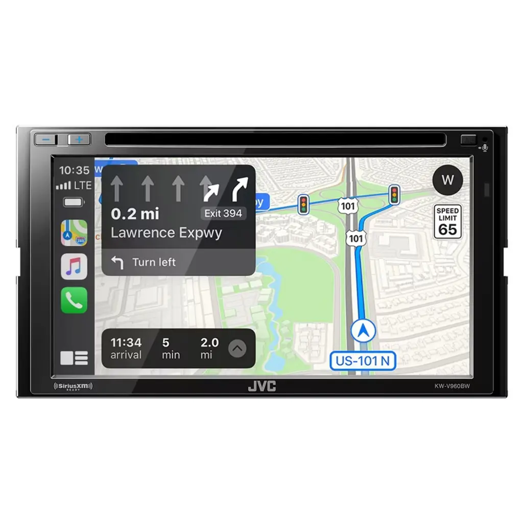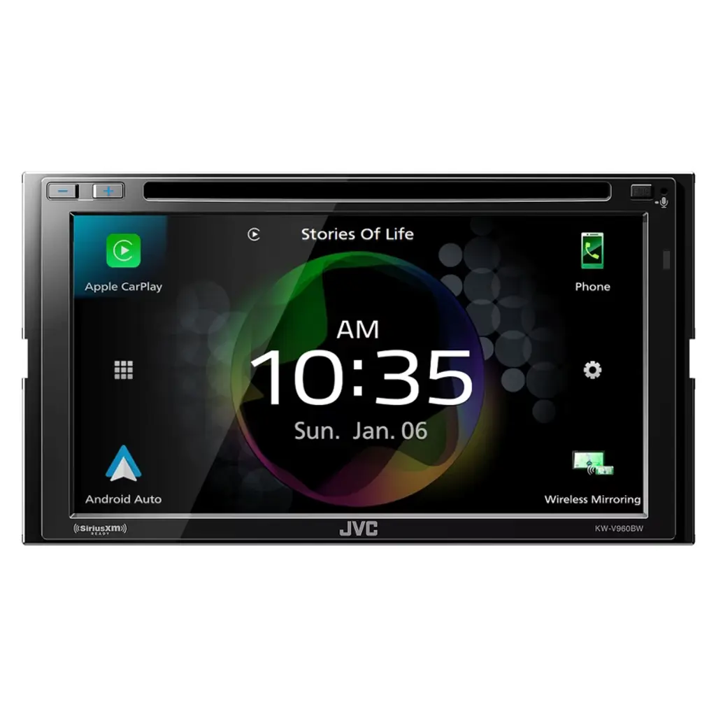 JVC Bundle - JVC KW-V960BW 6.8" Wireless Apple CarPlay/Android Auto MultiMedia Receiver with Dash Kit, Wiring Harness and Antenna Adapter, Compatible with Jeep Wrangler, 97-02 - This bundle includes a JVC KW-V960BW Works with Wireless CarPlay, Wireless Android Auto, CD/DVD AV Receiver, High-Res Audio, 4-Camera Input, a Metra 95-6549 Dash Kit Compatible with 1997-2002 Jeep Wrangler, a Metra 70-1817 Wiring Harness Compatible with 1984-2005 Chrysler-Plymouth-Dodge-Jeep, a pry kit, and a Creative Audio coozy. JVC KW-V960BW Multimedia Receiver featuring 6.8" Clear Resistive Touch Monitor / Wireless Apple CarPlay / Wireless Android Auto /4-Cam Input / High-Resolution Audio / iDatalink Maestro Ready / Bluetooth® / 13-Band EQ CarPlay And Android Auto over Wi-Fi! Make and receive phone calls, listen to your favorite music, all with less intrusion so you can drive safely. Enjoy your apps, and view Maps, on the receiver’s big screen. CarPlay is a safer way to use your iPhone in the car. Simply talk to Siri or touch the receiver’s display and get directions from Map, make phone calls, listen to voicemail, send and receive texts, and listen to music all in a way that allows you to stay focused on the road. Specifications - CD Player • CD-R/RW Compatible: Yes DVD Player • DVD-R/-RW, +R/+RW Compatible: Yes • Video CD Playback: Yes Monitor • Screen Size: 6.8"W VGA Screen • Touch Panel: Clear Resistive • Monitor Touch Control: Yes Metra 95-6549 Dash Kit Compatible with 1997-2002 Jeep Wrangler Description ISO DDIN radio provision Complete center dash panel for a factory look Wiring and Antenna Connections Harness 70-1817 (sold separately) Antenna Adapter Not required Metra 70-1817 Wiring Harness Compatible with 1984-2005 Chrysler-Plymouth-Dodge-Jeep Description Plugs into car harness at radio Provides Power – 4 Speaker connection