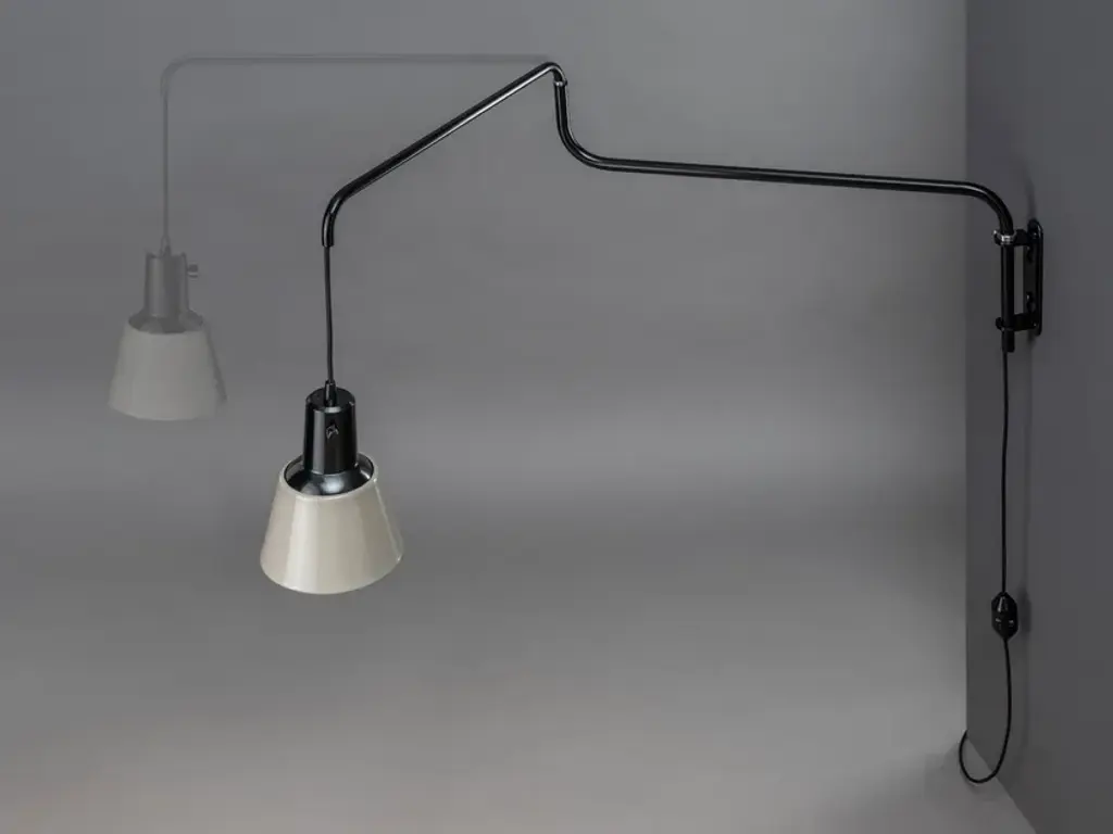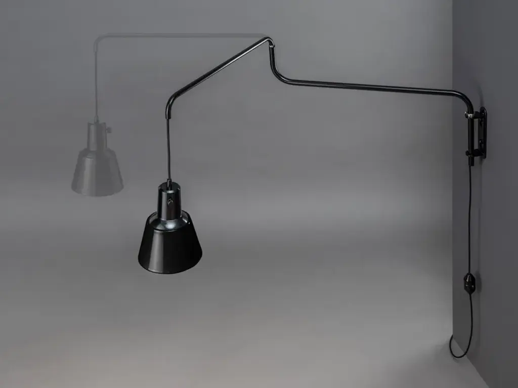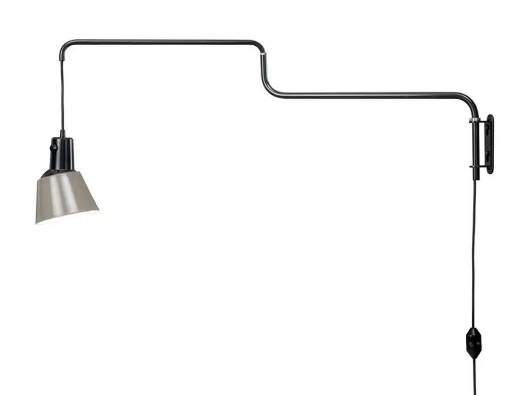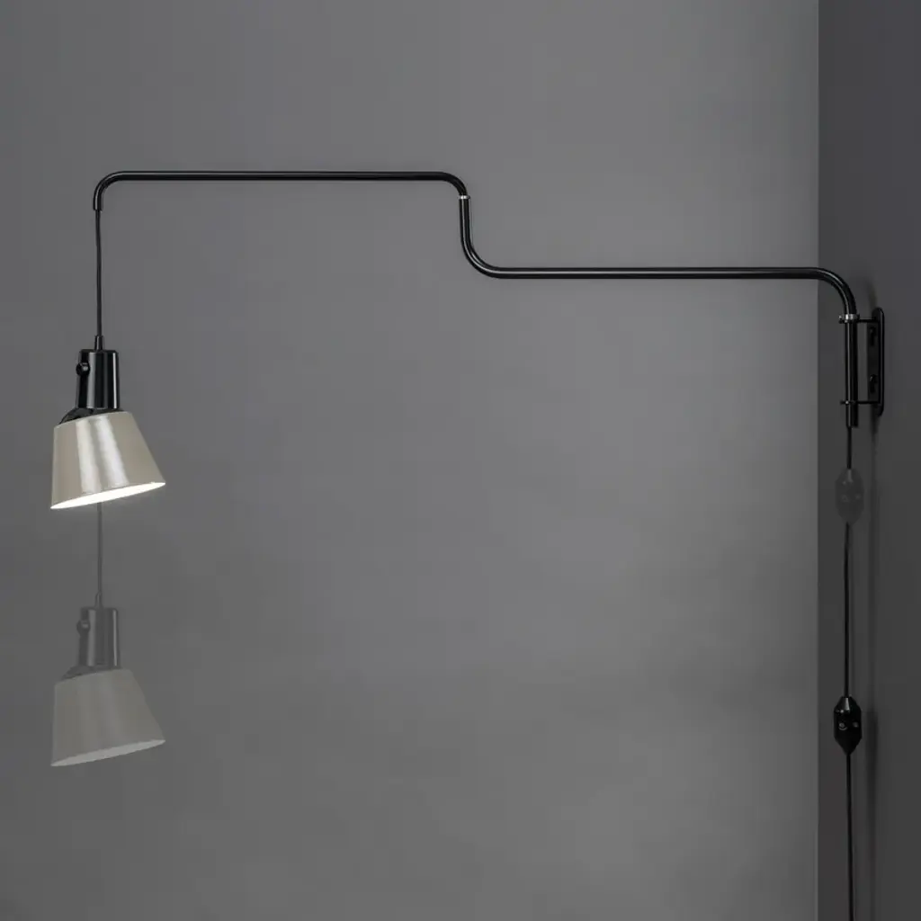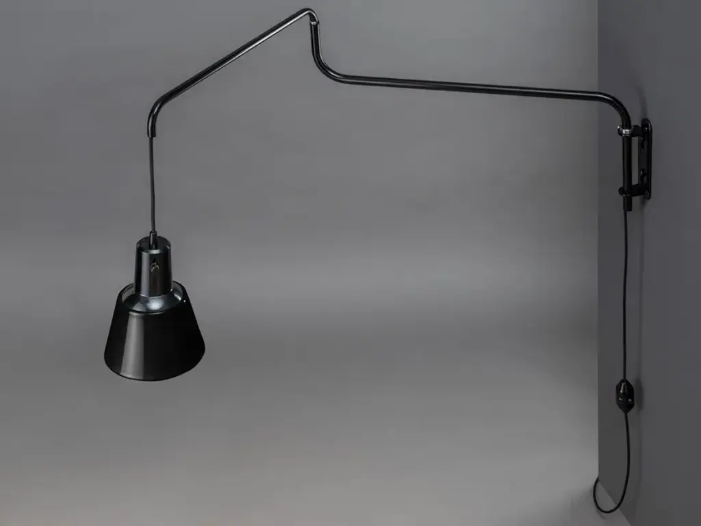 K830 is a functionally unique wall luminaire from the early 1930s that has been carefully re-developed according to historical models while respecting historical manufacturing methods.The freely swivelling arms of the luminaire allow flexible alignment. A special feature is the infinitely variable height adjustment by means of the textile cable sliding in the tube and a counterweight to the luminaire head. Fine adjustment is made via the 360° swivelling lampshade.All individual parts of the lamp are manufactured in Germany and assembled by hand in Hamburg.Wall arms and bracket: tubular steel, black powder-coatedDome and rotary switch: bakelite blackLampshade: enamelled, concrete grey or blackInner surface: white enamelCable: black (textile)Equipment class: IICertified: CE/ROHIIlluminant: suitable for LED*Recommended are E27 retrofit LED with 2700-3500K and 6-10W (equivalent to 40-60W). Do not use classic incandescent or halogen bulbs with more than 40W