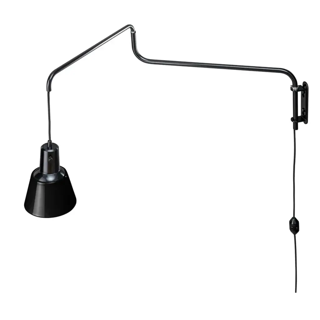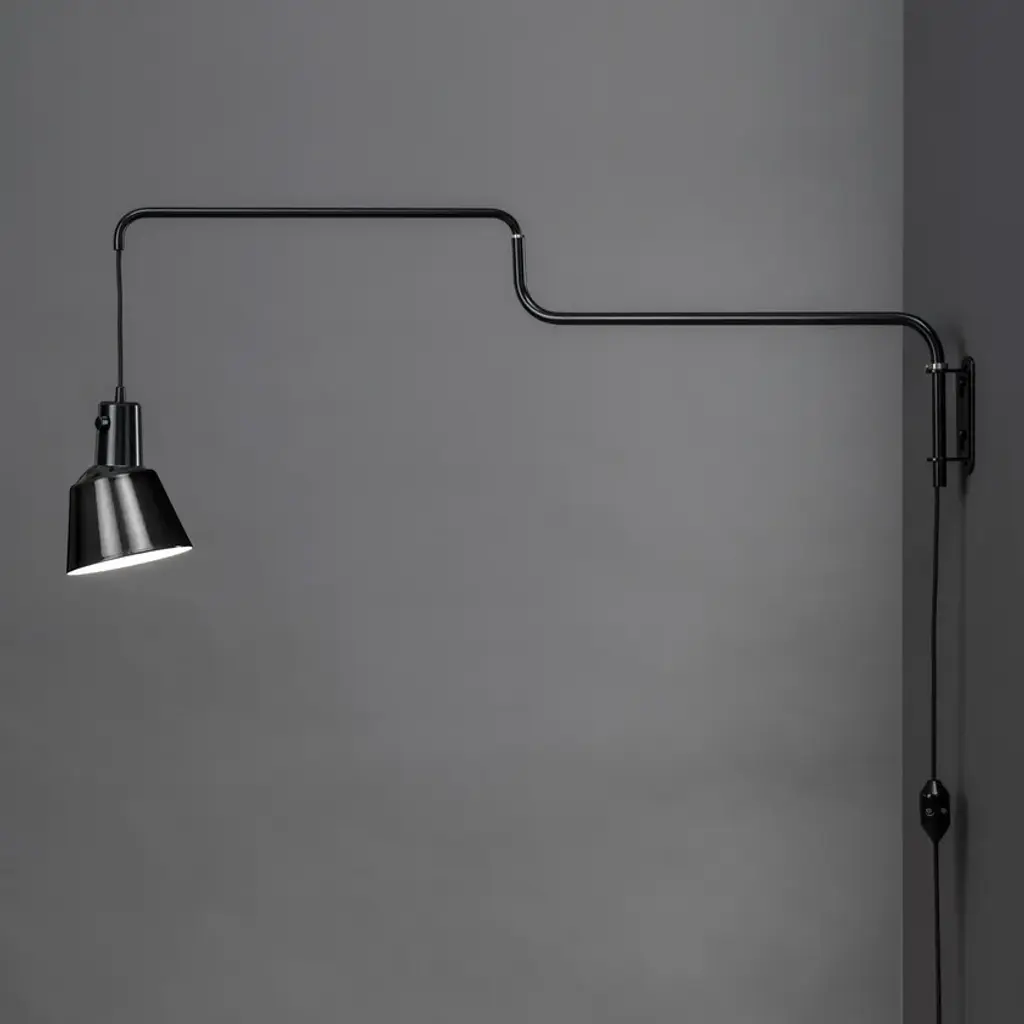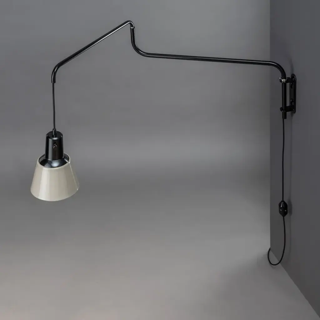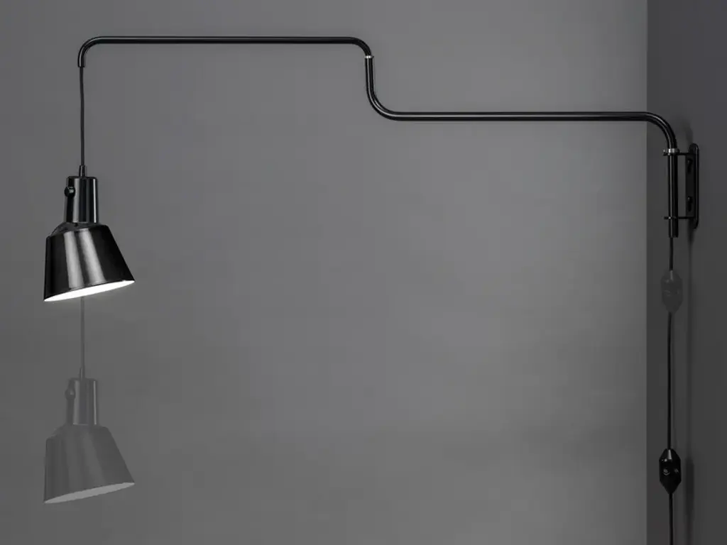 K830 is a functionally unique wall luminaire from the early 1930s that has been carefully re-developed according to historical models while respecting historical manufacturing methods.The freely swivelling arms of the luminaire allow flexible alignment. A special feature is the infinitely variable height adjustment by means of the textile cable sliding in the tube and a counterweight to the luminaire head. Fine adjustment is made via the 360° swivelling lampshade.All individual parts of the lamp are manufactured in Germany and assembled by hand in Hamburg.Wall arms and bracket: tubular steel, black powder-coatedDome and rotary switch: bakelite blackLampshade: enamelled, concrete grey or blackInner surface: white enamelCable: black (textile)Equipment class: IICertified: CE/ROHIIlluminant: suitable for LED*Recommended are E27 retrofit LED with 2700-3500K and 6-10W (equivalent to 40-60W). Do not use classic incandescent or halogen bulbs with more than 40W