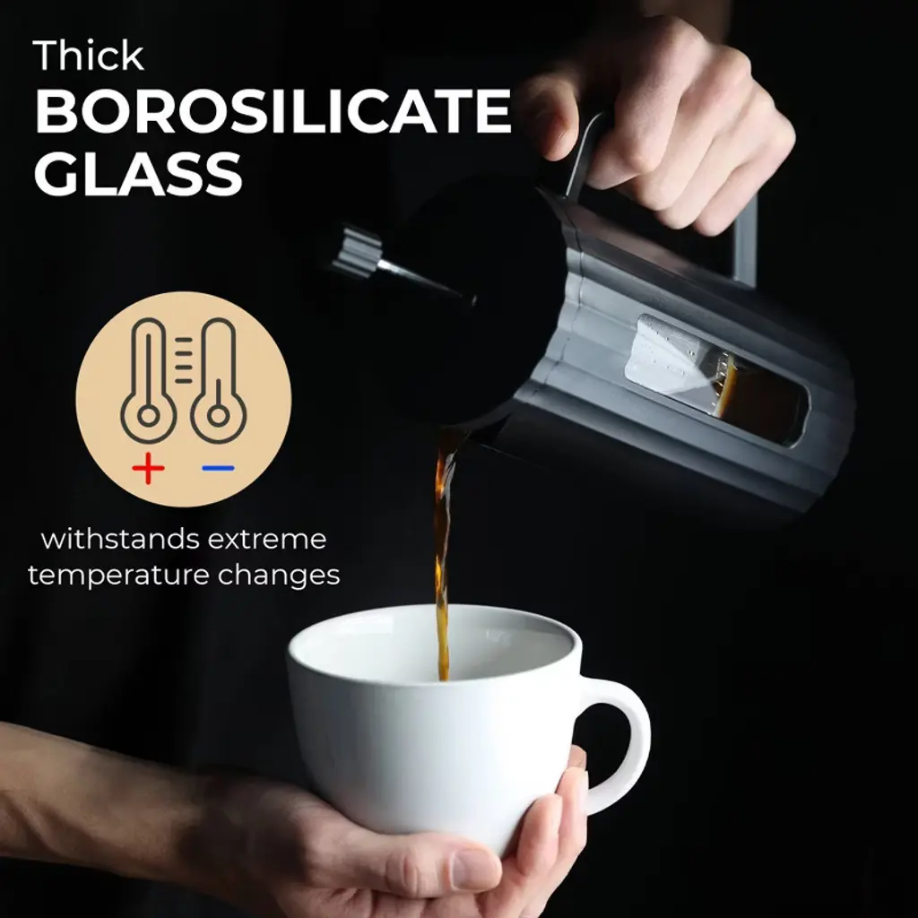 Better mornings with the fragrance of freshly brewed coffee in the home, the ritual of waking up to your first cup, and the joy of gathering around coffee with friends: these are our reasons for being. MAKING IT EASY What’s more, we believe in making life easy for you, and giving you the tools to grind your own beans at the touch of a button is one way of doing this. QUALITY COMPONENTS Our quality-promise is another way of making things easy, because our French press tempered glass, solid and hard-working.