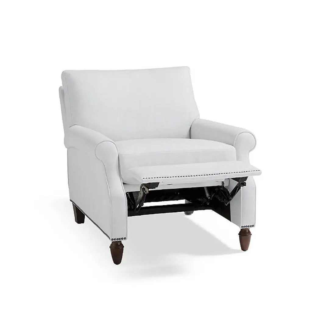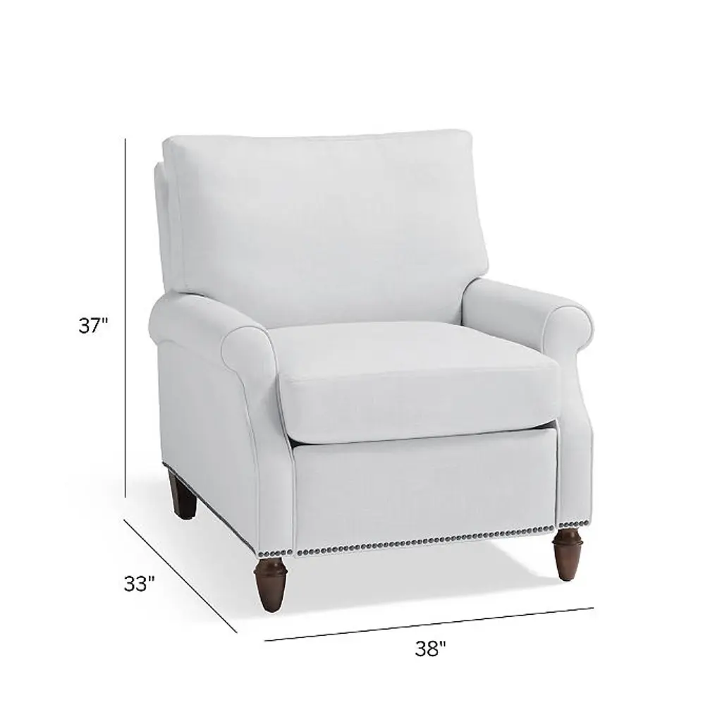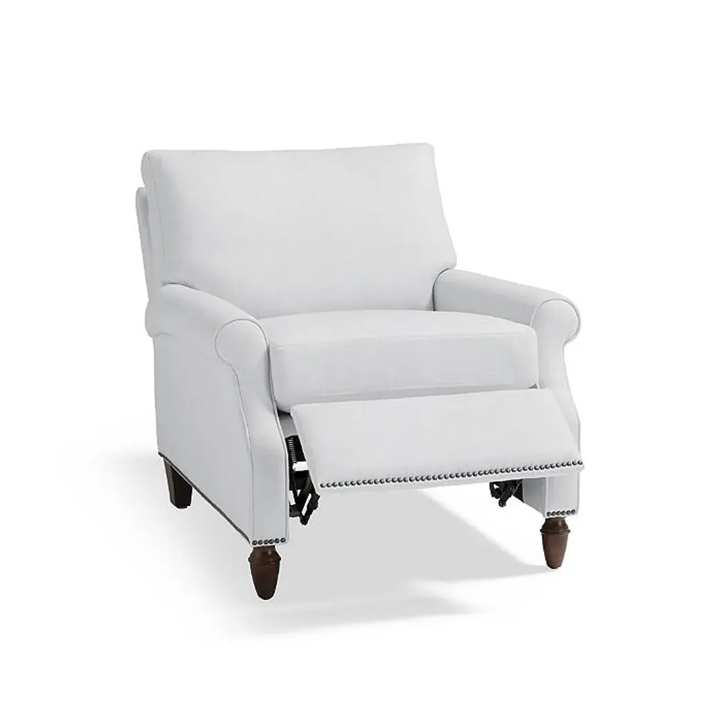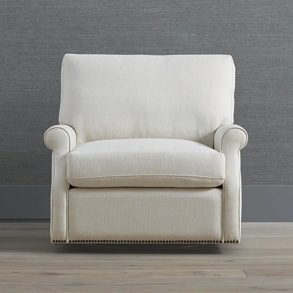 The traditional silhouette of each item in our Kahli Collection is accentuated by rolled arms, generously filled cushions and hand-placed nailhead trim. A hardwood frame is paired with a fiberglass rod suspension system for extra durability, which is then topped with high-density foam cushions wrapped with feathers and down for exceptional softness. Premium Series Upholstery Collection Engineered hardwood frame High-density foam cushions wrapped with feathers and down for maximum comfort Flexible fiberglass rod suspension provides durable, long-term and eco-friendly support that resists bending, warping and cracking Handcrafted Includes one seat cushion and one back cushion; seat cushion is reversible Recliner opens smoothly with a push on the arms; closes easily with simple leg pressure Upholstered seat, back, arms and sides Velvet naturally ages over time, resulting in light marks or bruising that add to its character and sheen Performance fabric resists stains and repels water and oils, ensuring easy cleaning Leather is a natural material, retaining character marks and subtle shade variations; no two pieces are exactly alike On leather option, velvet decking and cushion underside allow air to flow from the cushion through the decking Performance leather is treated to reduce scratching, fading, staining and color variation Maple wood legs with Brownstone finish For indoor use Plastic nonmarring floor glides Levelers To prevent injuries or damage to item, recommended team lift (two or more people) for furniture placement Proudly handcrafted in the USA with imported materials, our frames and upholstery are made for life A Frontgate exclusive. At Frontgate, our primary focus is quality. We guarantee that every product we sell will stand up to the supreme test – our customers' satisfaction. To learn more about our policies, visit our Shipping & Processing, Returns & Exchanges and Warranty & Price Guarantee pages. Please note: Digital renderings of custom upholstery may differ in pattern placement from the actual item; colors can vary from screen to screen.