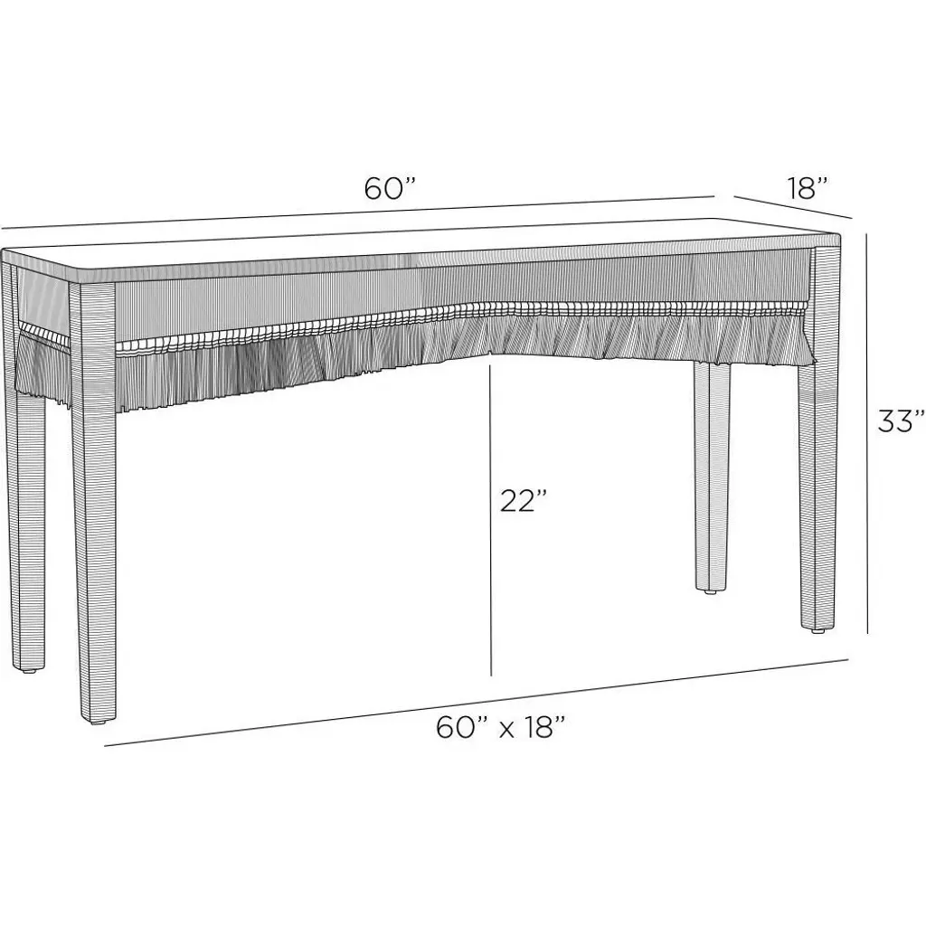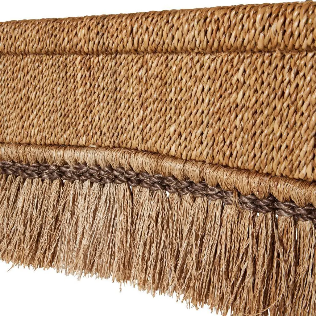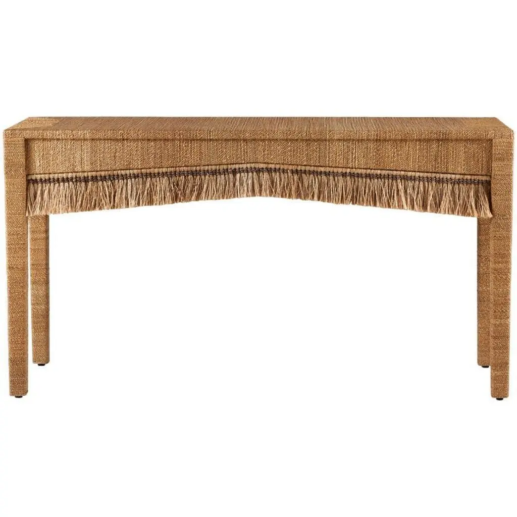 A naturally wonderful console was handmade of natural abaca. Mounted on tapered rectangular legs, it can be topped with a glass panel for added durability. Inspired by layered tusks, flourishes of fringe will add an impactful accent to any coastal or modern space. Finish will vary.