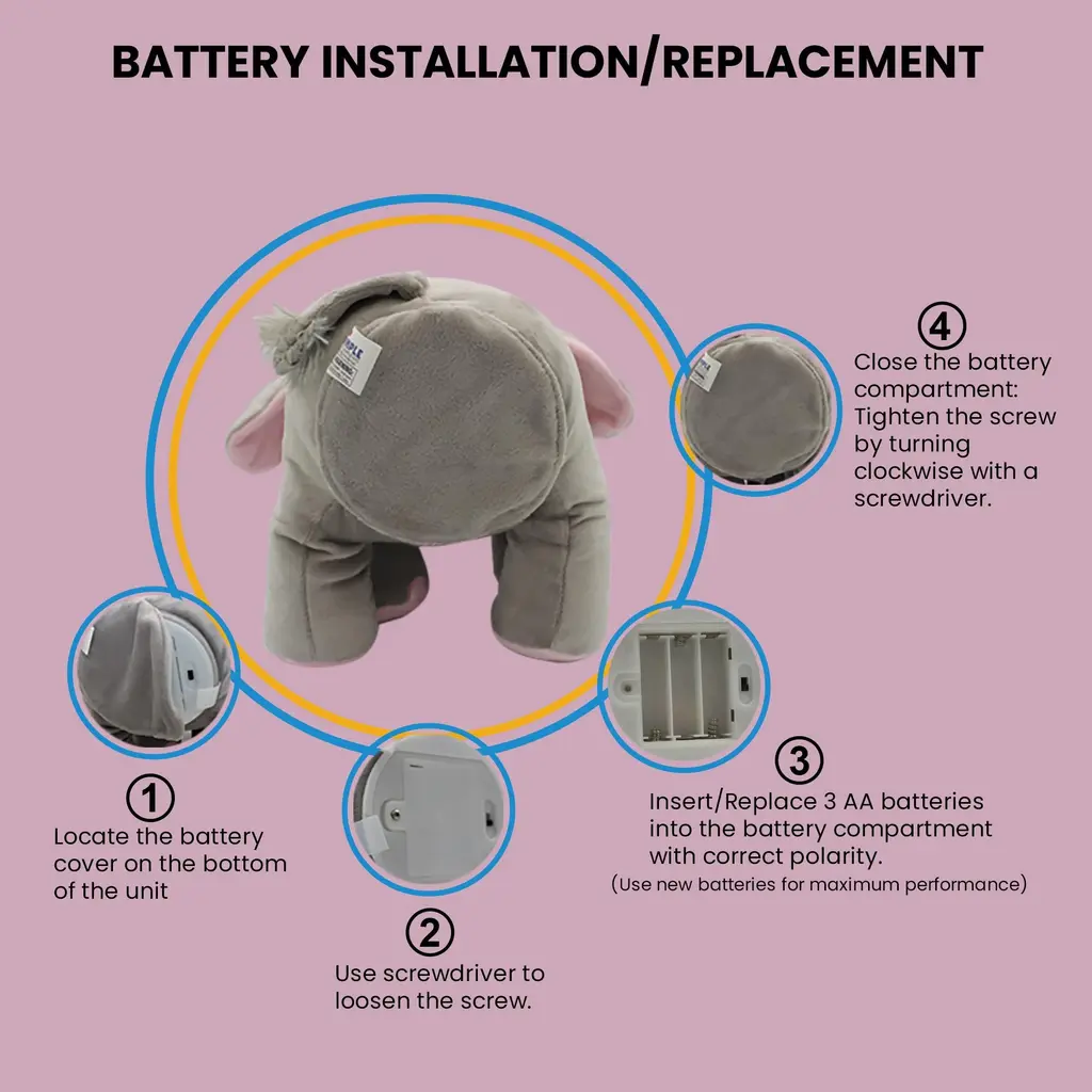 Meet Dimple Kaia the Elephant! The delightful singing animated elephant specially designed for the elephant lover in your home. Kaia the elephant is equipped with two interactive play modes activated by your child’s touch. Your kids will love to sing along with friendly Kaia's charming rendition of ‘Do Your Ears Hang Low’ or enjoy an engaging game of peek-a-boo that will warm your heart. Simply press her right foot for music or left foot to let the games begin!Kaia playfully hides her eyes with her giant stuffed elephant ears to “disappear” during peek-a-boo. Kaia the Elephant animated plush is surface-washable for easy cleaning and is appropriate fun for all ages. Make a new delightful addition to your child’s stuffed animal collection today!High-Quality FunDimple is committed to providing quality toys that you and your baby, toddler or child can grow with and love! All of our products like Kaia the Elephant come with a 1 year warranty for long lasting fun and are durable enough for everyday play.Entertainment AnywhereKaia is small, soft and compact making it easy to take her anywhere! Take your loveable singing toy elephant on the road, into the store or even to grandma’s house for an adorable experience the entire family can appreciate.Playtime is also soothingChildren attach to stuffed animals easily and effortlessly. Kaia's sweet singing voice and interactive game mode are often effective in calming or distracting your child so he or she spends less time upset and more time in absolute joy!Dimple Kaia Baby Animated Stuffed Plush Singing Peek A Boo Elephant - the perfect companion for your little one's playtime adventures! This enchanting INTERACTIVE MUSICAL TOY is thoughtfully designed for TODDLERS, featuring an irresistibly cute peek-a-boo feature and animated moving ears that will captivate and entertain your child for hours on end.Not just a toy, this delightful elephant plush doubles as an ideal BABY GIFT. Complete with batteries for immediate play, it's a heartwarming addition to any nursery or as a cherished present for NEWBORNS and BABIES, embodying the perfect blend of cuddly charm and interactive play.Crafted to merge the appeal of an adorable BUNNY PLUSH with the lovable essence of a cuddly ELEPHANT STUFFED ANIMALS, this toy sparks imagination and companionship for both BABIES and TODDLERS, encouraging their sensory development and fostering interactive play from an early age.Beyond its cute appearance, this plush elephant boasts educational benefits, stimulating SENSORY DEVELOPMENT and offering engaging play experiences for INFANTS as well. Its playful tunes and interactive PEEK-A-BOO MOVEMENTS create an enthralling world of entertainment, making it an invaluable addition to your child's collection of beloved BABY TOYS and STUFFED ANIMALS.Join the fun-filled world of the Dimple Kaia Baby Animated Stuffed Plush Singing Peek A Boo Elephant - where imagination meets interactive play for your little one's joy and development!"