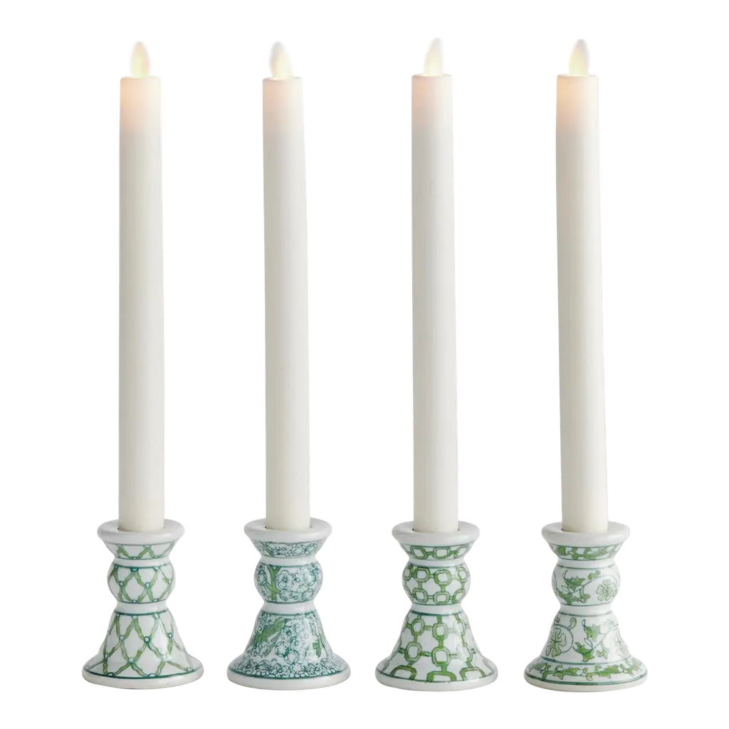 Elevate your home's ambiance with this harmonious set of four green porcelain taper holders. Handmade with care, each pillar showcases its own distinctive motif, adding a touch of French country-inspired charm to your bookshelf, mantel, or entry console. The calming green hue is known for its balancing effect, making these coordinating mini taper holders a welcome addition to any space. Simply add your favorite taper candles and enjoy the soothing atmosphere they create.
