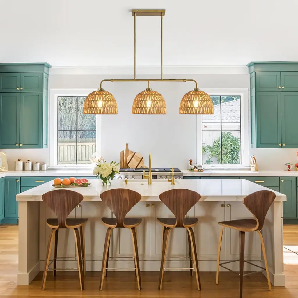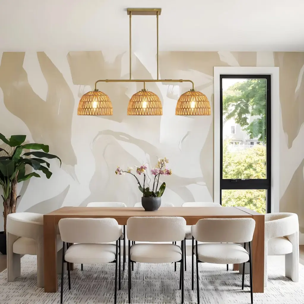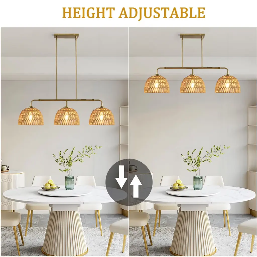Transform your kitchen island into a cozy retreat with the KAISITE Rattan Shade 3-Light Pendant Light. Designed with a natural handcrafted rattan shade and a durable metal frame, this pendant light blends modern elegance with rustic warmth. The adjustable hanging height and sloped ceiling compatibility make it versatile for different kitchen layouts, while its dimmable function allows you to create the perfect ambiance for any occasion. Requiring three E26 bulbs (not included), this fixture comes with all necessary mounting hardware for easy installation.