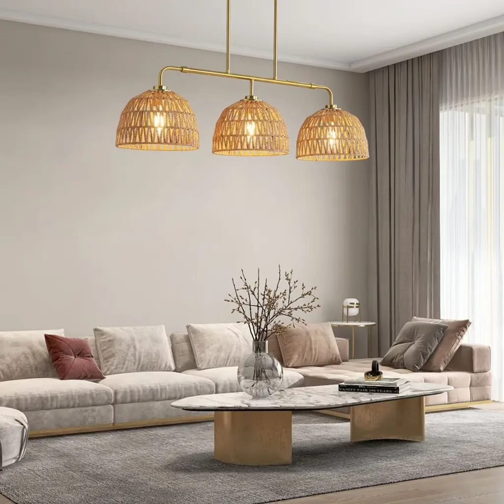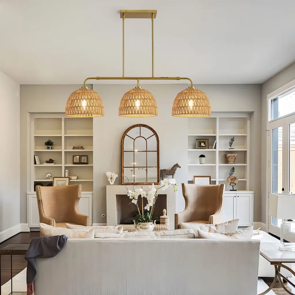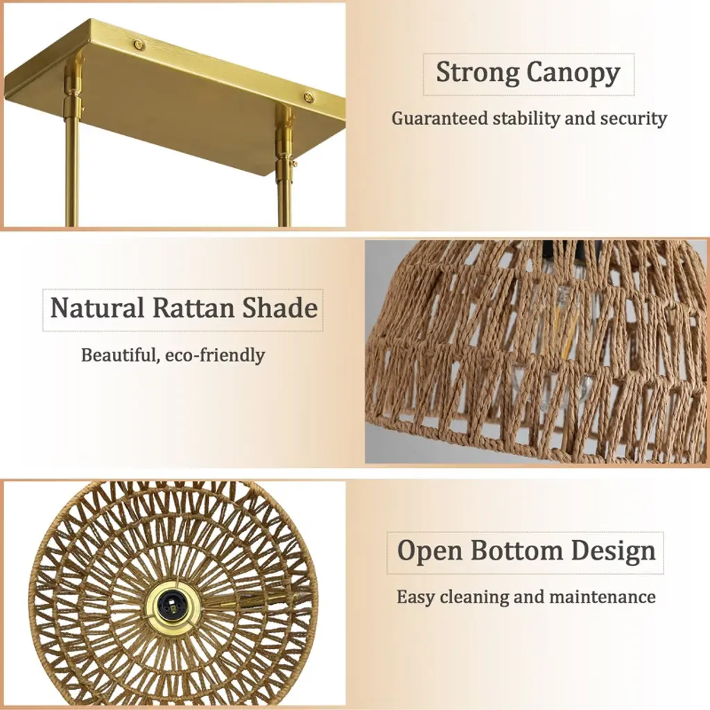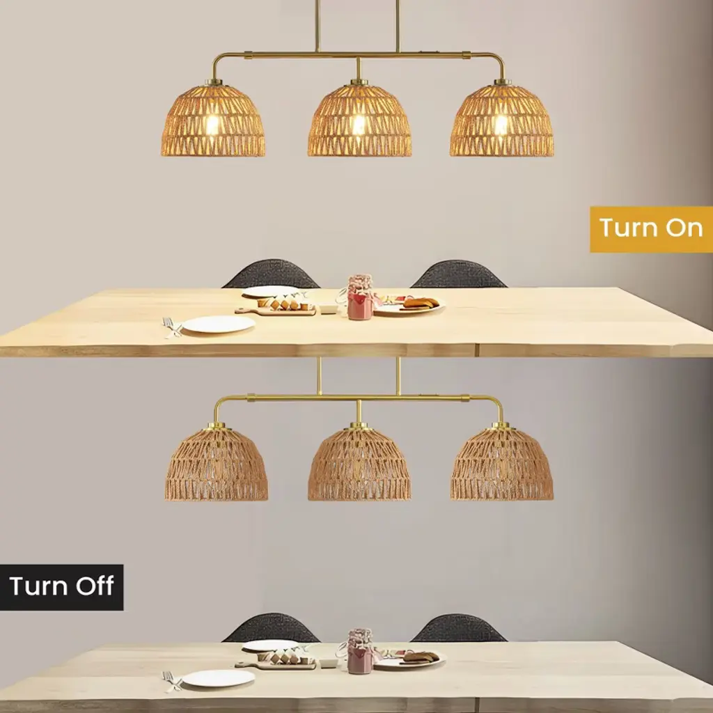 Transform your kitchen island into a cozy retreat with the KAISITE Rattan Shade 3-Light Pendant Light. Designed with a natural handcrafted rattan shade and a durable metal frame, this pendant light blends modern elegance with rustic warmth. The adjustable hanging height and sloped ceiling compatibility make it versatile for different kitchen layouts, while its dimmable function allows you to create the perfect ambiance for any occasion. Requiring three E26 bulbs (not included), this fixture comes with all necessary mounting hardware for easy installation.