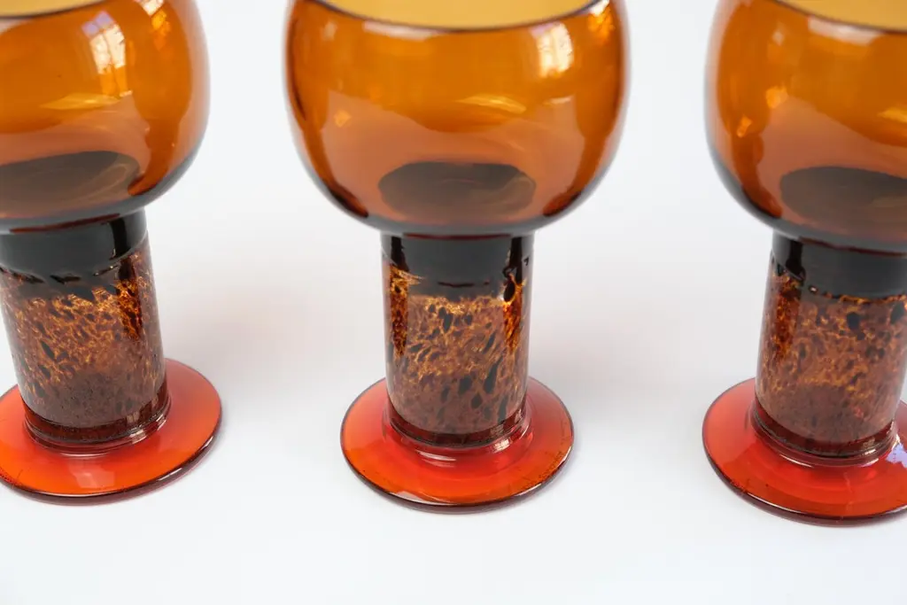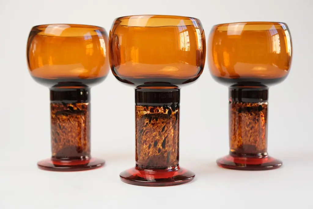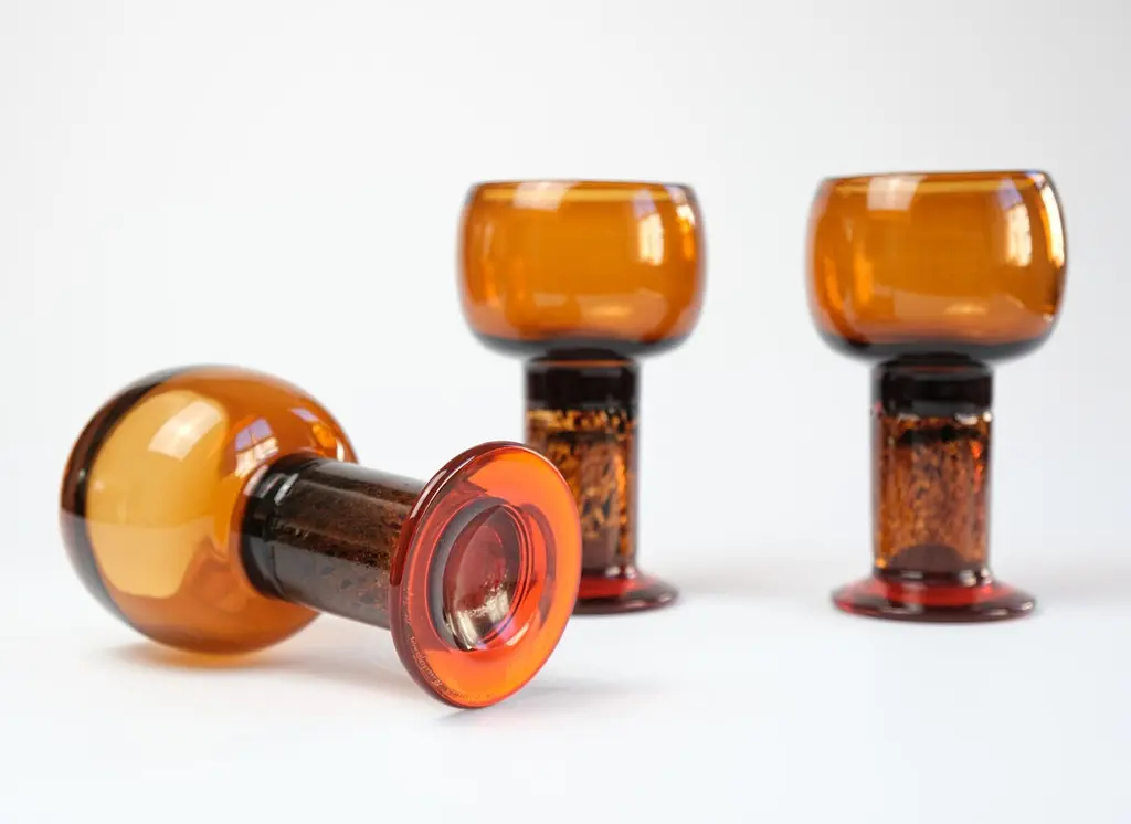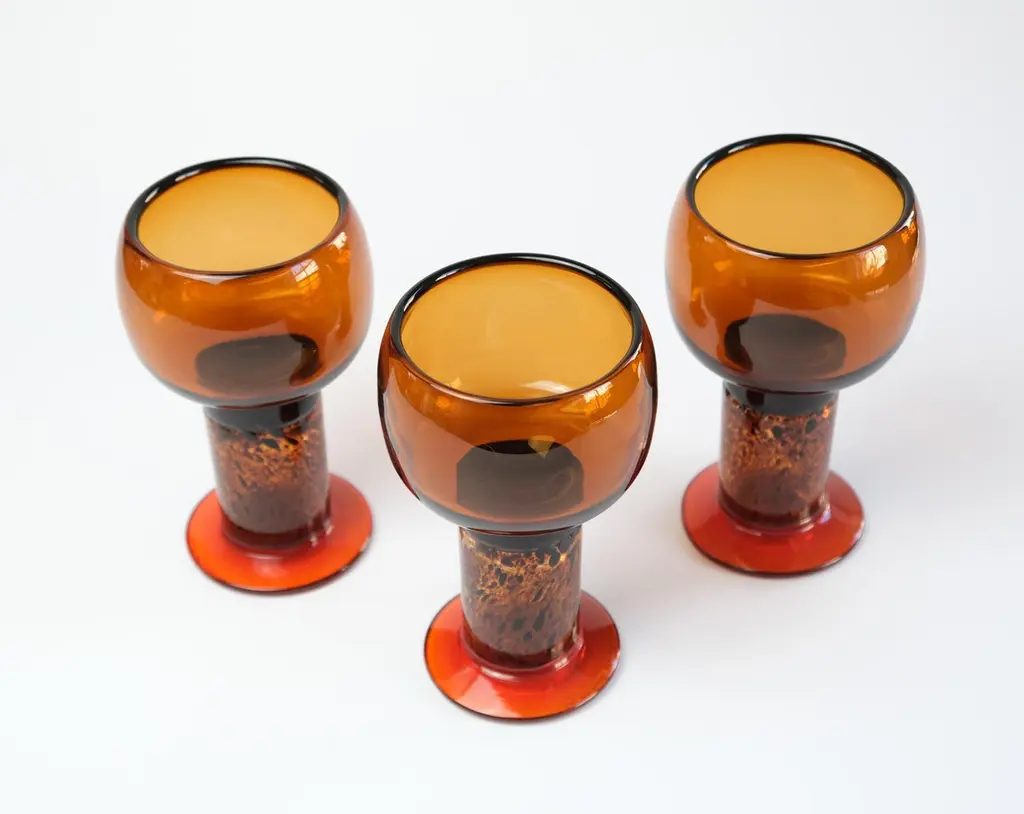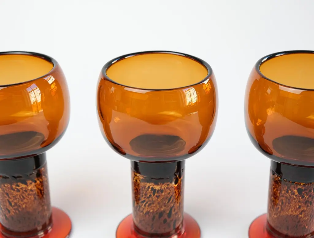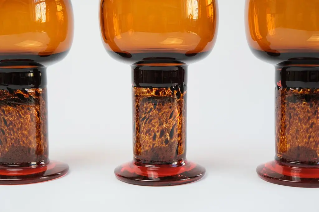 For sale is a stunning example of Kaj Franck’s timeless design for Nuutajärvi Notsjö – the celebrated KF539 “Pokaali” goblet, standing at an impressive 16cm in height. This piece, hand-signed to the base “Kaj Franck Nuutajärvi Notsjö”, is a true collector’s gem, beautifully preserved and in superb condition. With its striking form and rare colourway, it perfectly encapsulates the balance of simplicity and refinement that defines mid-century Finnish glass.This goblet, of which there are 3 identical ones available, features a warm amber bowl and mottled stem, paired with a richly contrasting ruby red foot, a rare and desirable combination that highlights Franck’s masterful use of colour. The KF539 model is one of Franck’s most sought-after “Pokaali” (trophy) forms – a series that blurs the line between functional tableware and sculptural art glass. Created at the historic Nuutajärvi glassworks, each goblet was crafted by hand, making no two exactly alike. Franck’s minimalist ethos — removing the unnecessary to reveal pure form — is evident in every curve and proportion of this elegant piece. A refined, collectable statement of Scandinavian design history.Kaj Franck (1911–1989) is often referred to as the “conscience of Finnish design” for his visionary approach to functionalism, sustainability, and aesthetics. As artistic director of Arabia and a key figure at Nuutajärvi, he redefined everyday objects with clarity and purpose. His work — from glassware to ceramics — embraced universal design, stripping away ornament in favour of form, balance, and usability. Today, Franck’s creations are held in museums worldwide, and his legacy continues to inspire generations of designers and collectors alike.