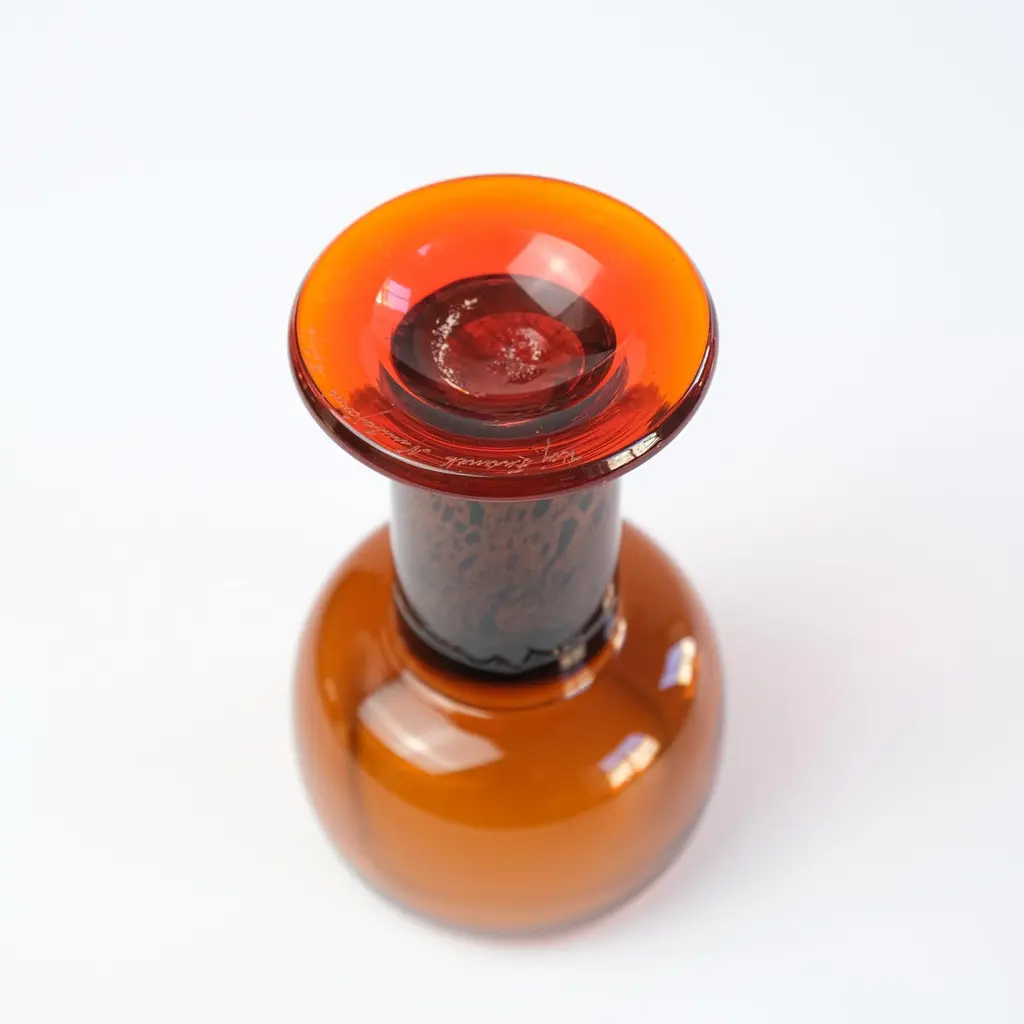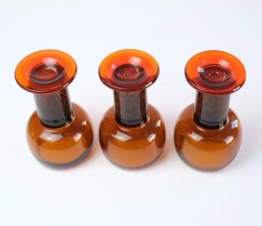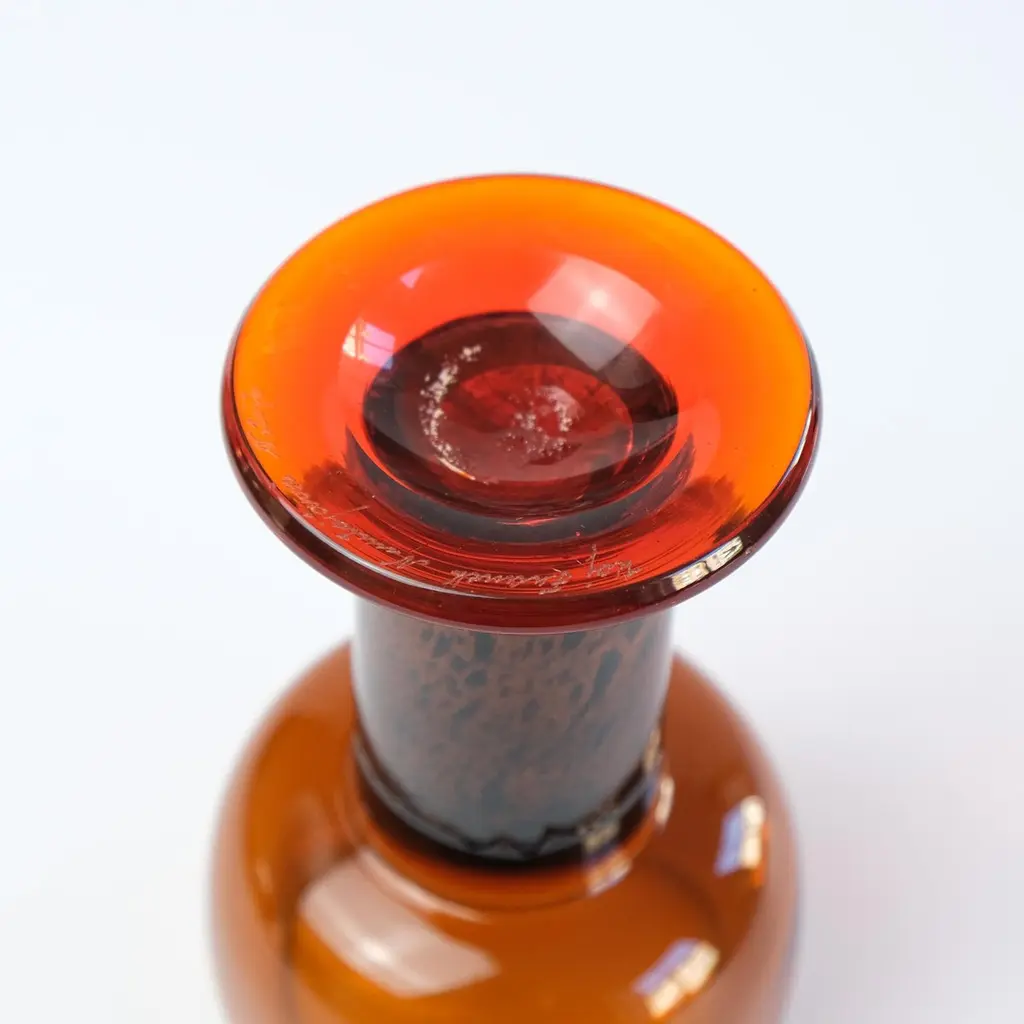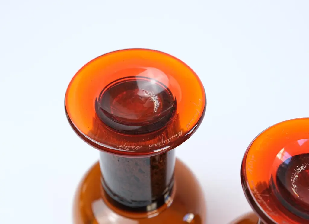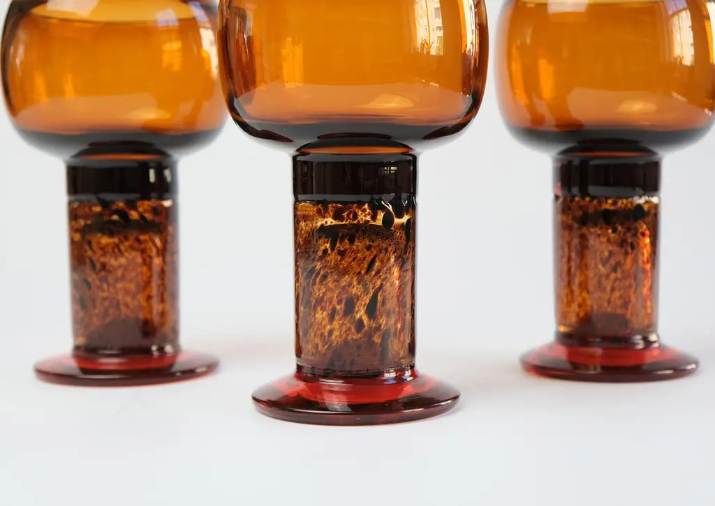 For sale is a stunning example of Kaj Franck’s timeless design for Nuutajärvi Notsjö – the celebrated KF539 “Pokaali” goblet, standing at an impressive 16cm in height. This piece, hand-signed to the base “Kaj Franck Nuutajärvi Notsjö”, is a true collector’s gem, beautifully preserved and in superb condition. With its striking form and rare colourway, it perfectly encapsulates the balance of simplicity and refinement that defines mid-century Finnish glass.This goblet, of which there are 3 identical ones available, features a warm amber bowl and mottled stem, paired with a richly contrasting ruby red foot, a rare and desirable combination that highlights Franck’s masterful use of colour. The KF539 model is one of Franck’s most sought-after “Pokaali” (trophy) forms – a series that blurs the line between functional tableware and sculptural art glass. Created at the historic Nuutajärvi glassworks, each goblet was crafted by hand, making no two exactly alike. Franck’s minimalist ethos — removing the unnecessary to reveal pure form — is evident in every curve and proportion of this elegant piece. A refined, collectable statement of Scandinavian design history.Kaj Franck (1911–1989) is often referred to as the “conscience of Finnish design” for his visionary approach to functionalism, sustainability, and aesthetics. As artistic director of Arabia and a key figure at Nuutajärvi, he redefined everyday objects with clarity and purpose. His work — from glassware to ceramics — embraced universal design, stripping away ornament in favour of form, balance, and usability. Today, Franck’s creations are held in museums worldwide, and his legacy continues to inspire generations of designers and collectors alike.