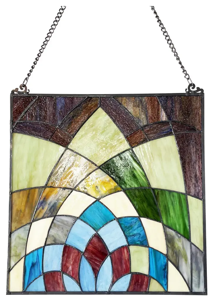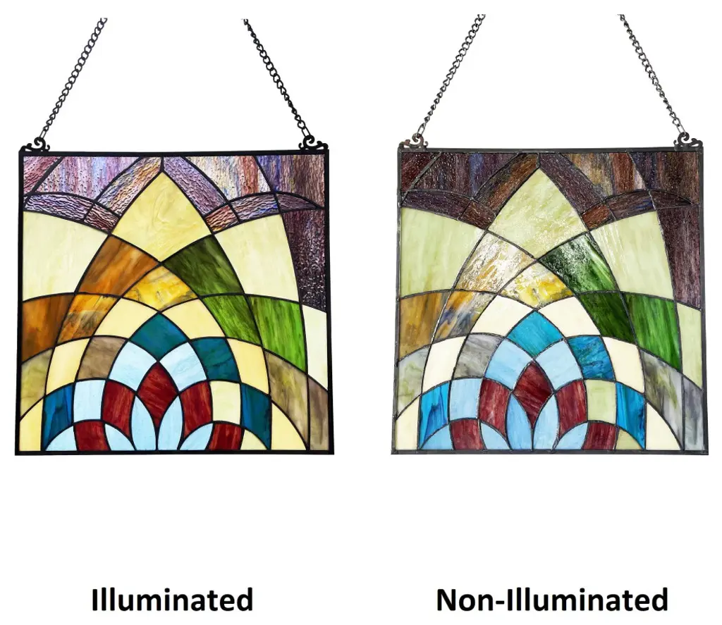 Kaleidoscope is a beautifully designed geometric style window panel using tiffany stained glass. This piece is made up of 53 pieces of hand-cut stained art glass, expertly pieced and soldered together to create each panel. Each of CHLOE''s Tiffany-style stained glass panels is formed using the very same technique developed by Louis Comfort Tiffany in the early 1900s, using hand-cut stained art glass, each wrapped in fine copper foil and soldered together at extremely high temperatures to form each unique panel. The exact size to the nearest inch may vary, and the exact color of each glass piece may vary due to each piece being hand-crafted. The first image is with the light shining through, the second image is with no light.