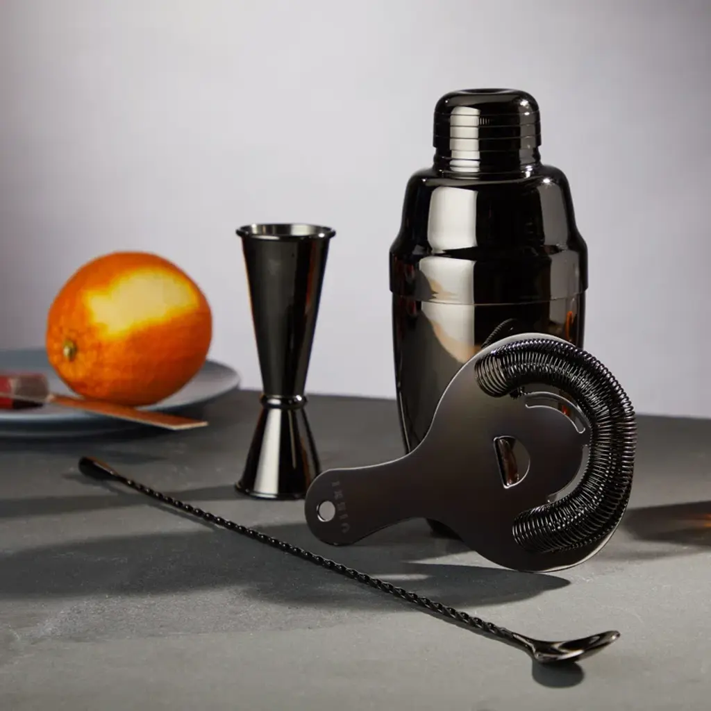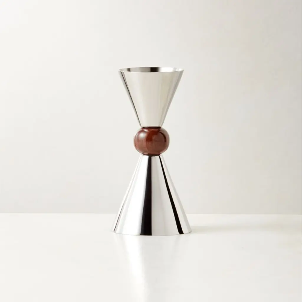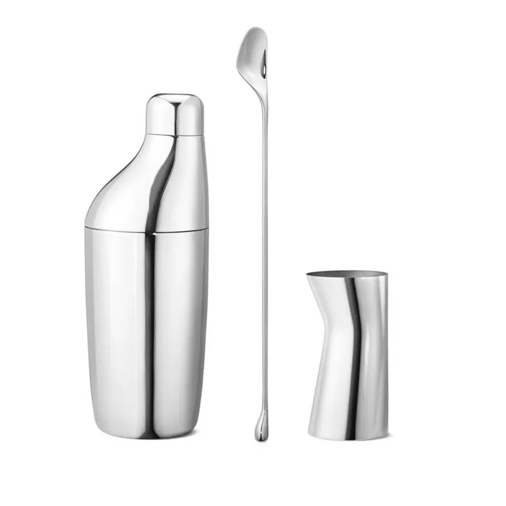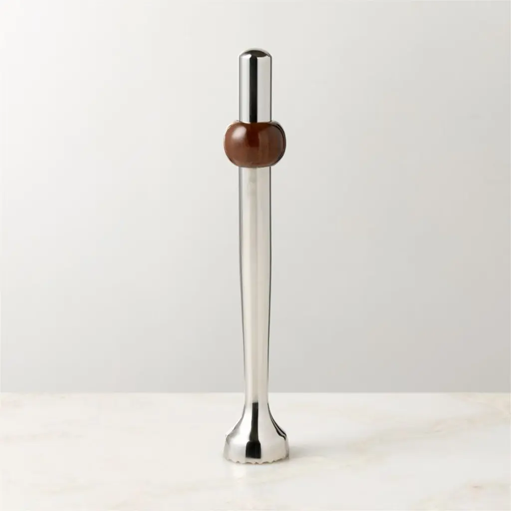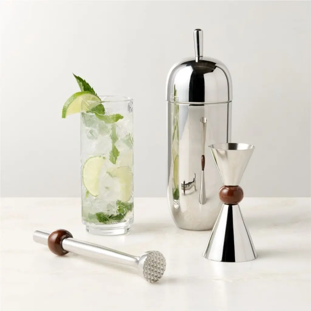 Inspired by vintage silver barware, stainless steel cocktail tool set is a sleek addition to the bar. Complete with a cocktail shaker, the set includes a double jigger and muddler with subtle walnut-finished accents that reflect a midcentury influence. CB2 exclusive.