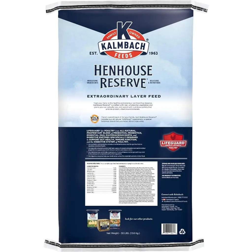 Kalmbach Feeds Henhouse Reserve 17% Whole Grain Complete Layer Feed is designed to provide a complete and balanced diet for your laying hens. This high protein textured superfood combines the visual appeal and taste of scratch feed with the comprehensive nutrition needed for optimal egg production and hen health. The inclusion of YolkProud ensures vibrant, richly colored egg yolks, while the Lifeguard blend supports digestive health, immune function, and overall vitality. Each 30 lb bag is filled with a carefully crafted mix of whole grains and vegetables, offering a nutritious and appealing feed that hens love. With Kalmbach Feeds Henhouse Reserve, you can trust that your hens are receiving top-quality nutrition, leading to healthier hens and better eggs.