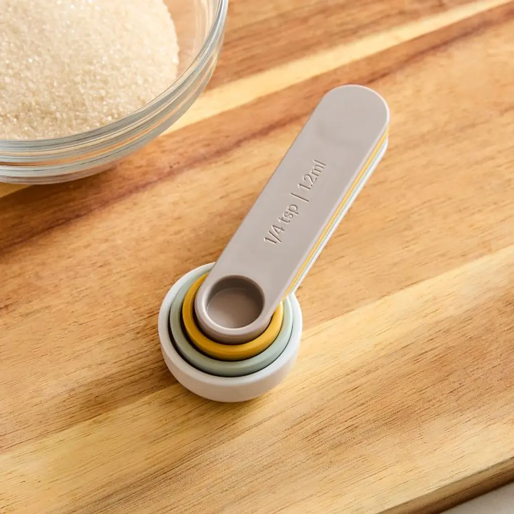 An exclusive design by Aaron Probyn. Learn more. Melamine. Sold as a set of 4 Spoons or Cups. Measuring Cups include: 1/4 cup, 1/3 cup, 1/2 cup and 1 cup. Measuring Spoons include: 1/4 tsp, 1/2 tsp, 1 tsp and 1 Tbsp. Made in China.