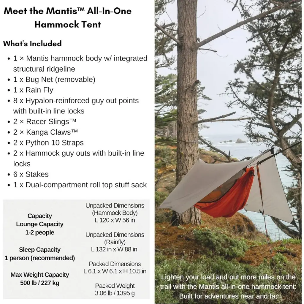 The Mantis is the ultimate compact all-in-one camping shelter. Made of 100% recycled material, the hammock tent is bluesign approved. An integrated insect net and featherlight rainfly are included to turn the hammock into a fully functional and protective tent. You can travel with all three main components or only take what you need for a lighter weight pack. The integrated Dragonet has convenient storage pockets and a mesh Stargazer panel that turns virtually transparent at night for a beautiful view. The rainfly offers protection from wind, rain, snow, and sun, making the Mantis an all-weather shelter. The Mantis takes only 60 seconds to set up with a knotless suspension, and tears down quickly for early morning starts. Customize your setup using six exterior and eight interior gear loops for attaching useful gear and accessories. The Mantis hammock system is smaller than a sleeping bag and lighter than a 1-person tent, offering a lightweight respite for hikers on the trail
