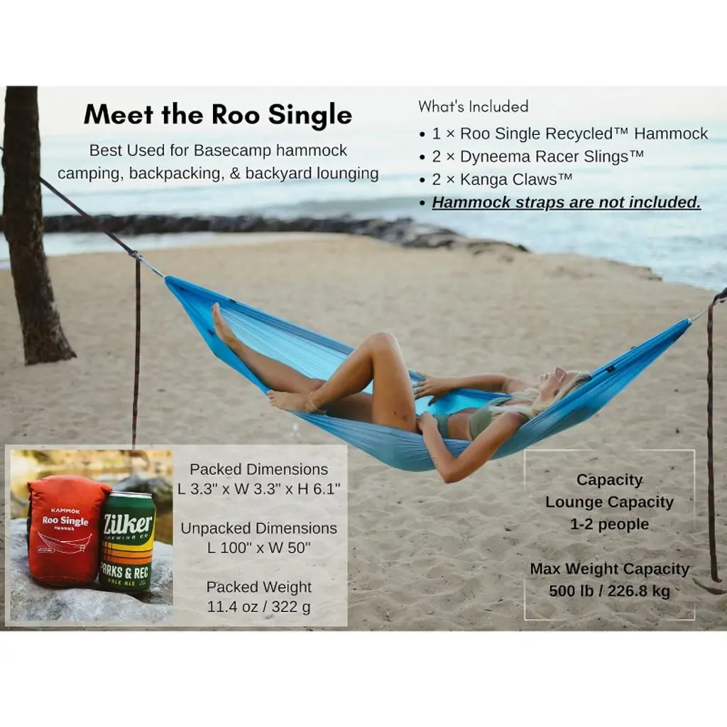 The Kammok Roo was designed to maximize compact comfort for campers and backpackers. Made with GravitasX fabric, this hammock is buttery soft, water-resistant, and incredibly breathable. The Roo is bluesign approved, as the nylon fabric is made from 100% recycled material that would otherwise be in a landfill. Customize your hang with eight gear loops along the side of the hammock to which you can attach your most important gear and accessories that you need quick access to. The Roo neatly packs into an attached roll-top, water-resistant stuff sack about the size of a soda can, making it extremely portable. You’ll barely notice the Roo is in your pack. It's the perfect size for keeping in your daypack or the backseat of your car. Despite its size and weight, the Roo doesn’t compromise on strength or durability. It boasts an industry-leading weight capacity of 500 pounds ensuring the safest sleep off the ground. Setup takes seconds with patented climbing-grade Kanga Claw carabiners that can each support up to 4,720 pounds.