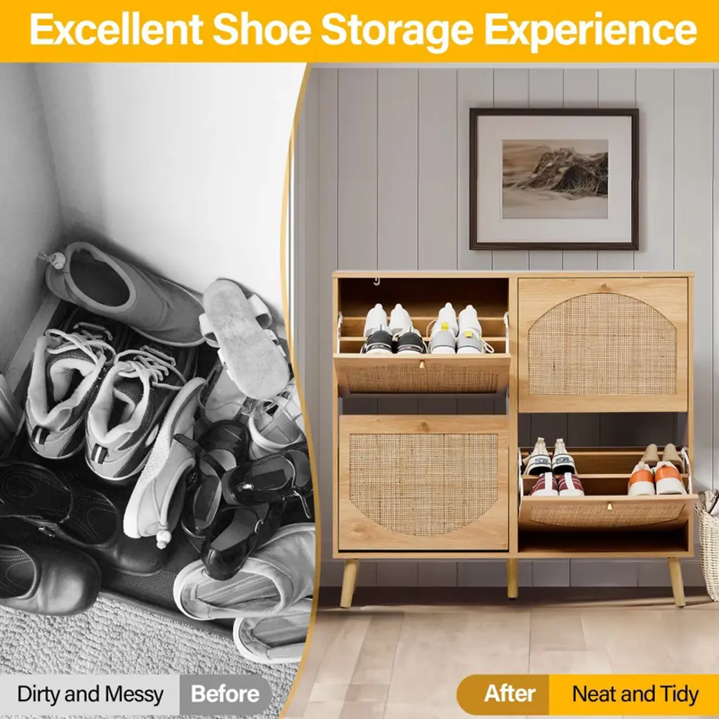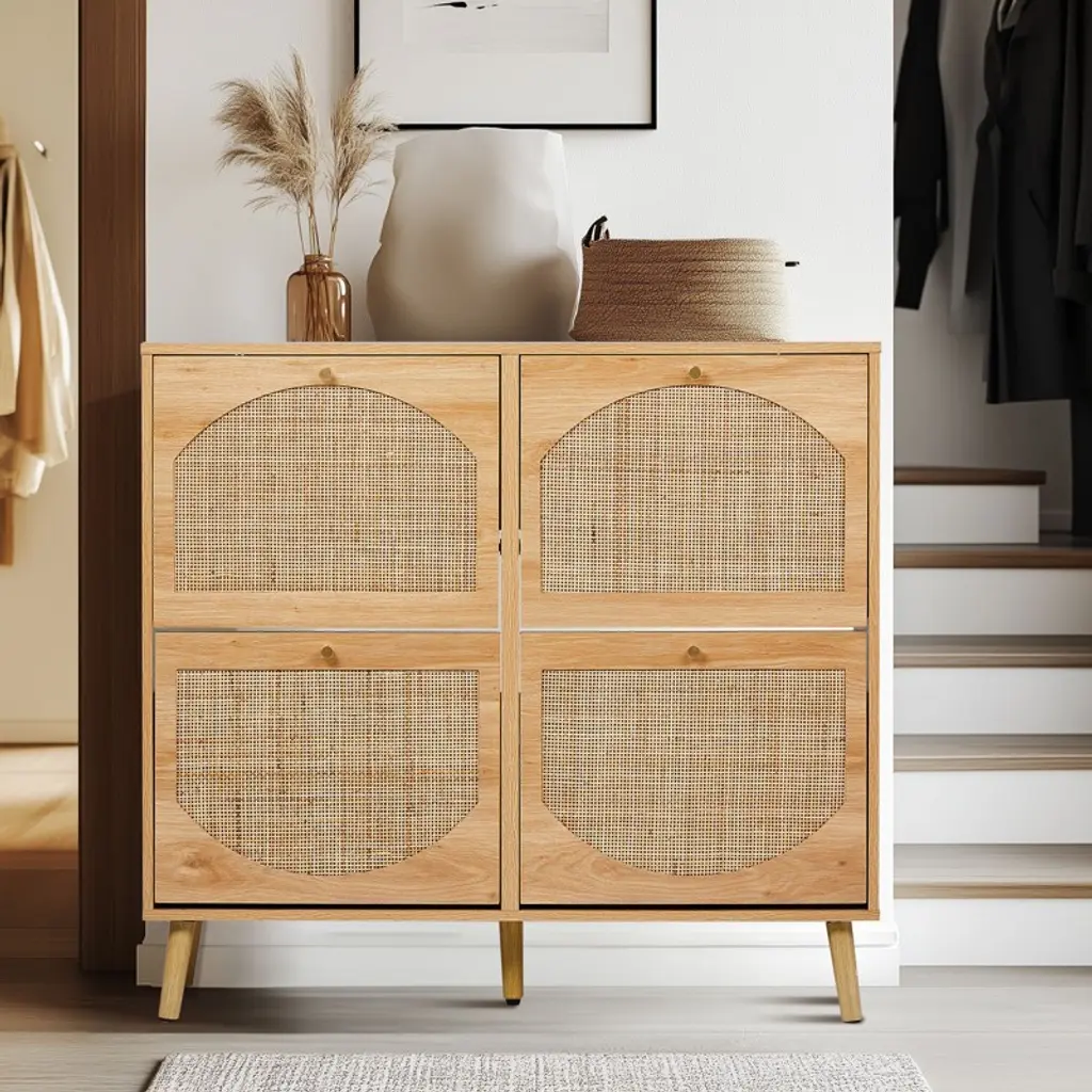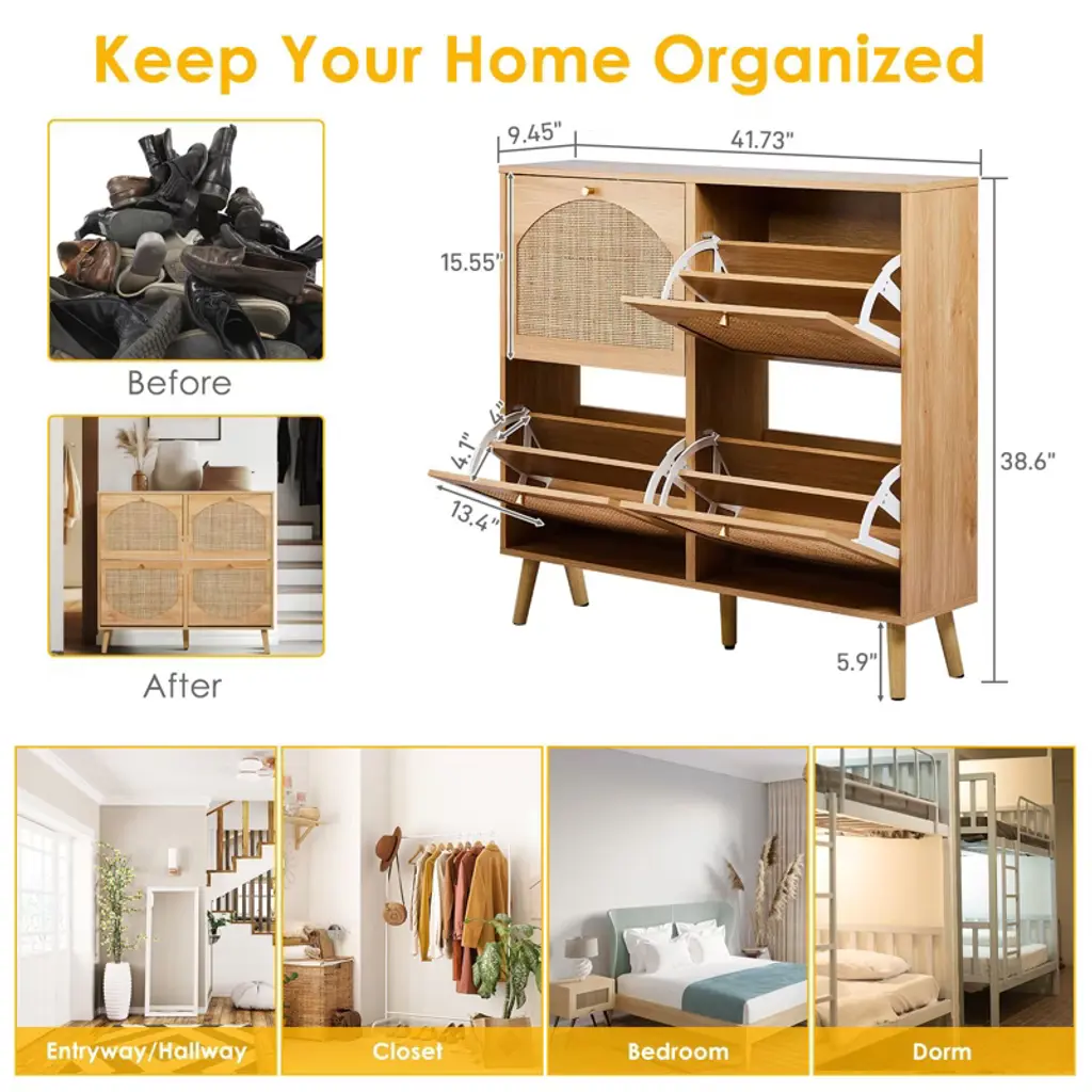 The elegant shoe cabinet with warm rattan which creates a modern and stylish style. Natural rattan skin increases the charm. The golden round handle brings a comfortable grip experience. It features a space-saving design, providing versatile storage and allowing it easier to place in entryways, hallways, living rooms, or bedrooms. It will perfectly keep your room away from the mess. Our double-layer shoe storage cabinet can accommodate a family's shoes. The shoe cabinet can be placed independently with five feet.