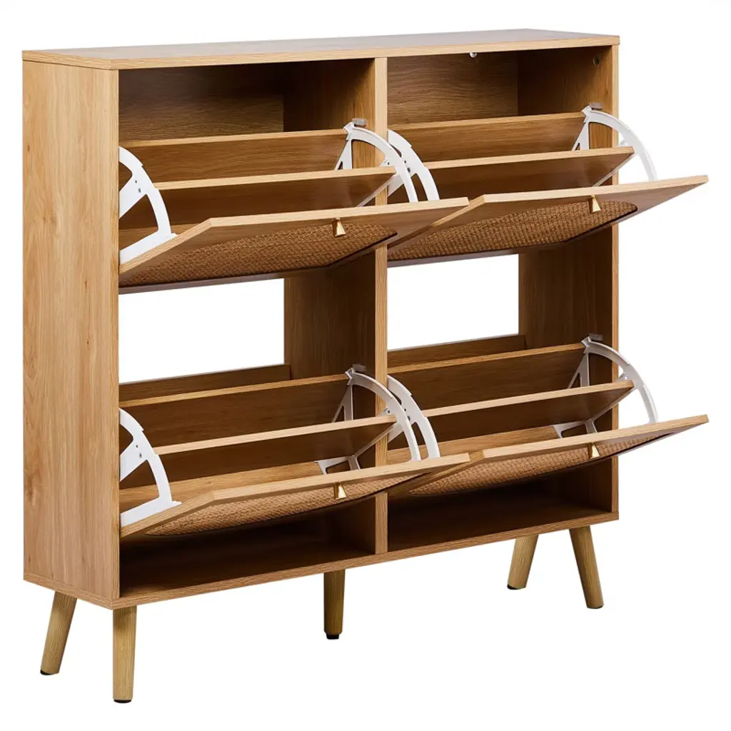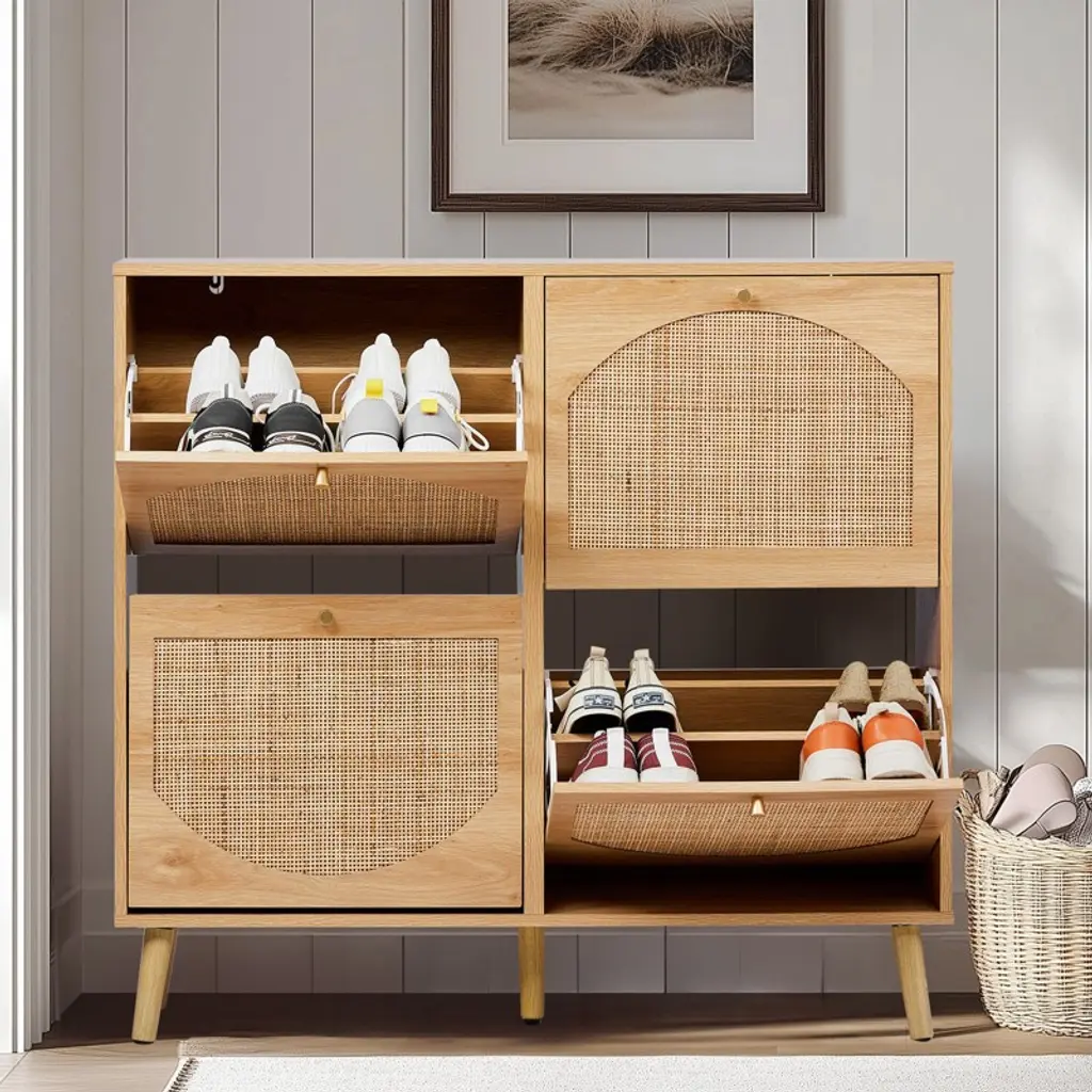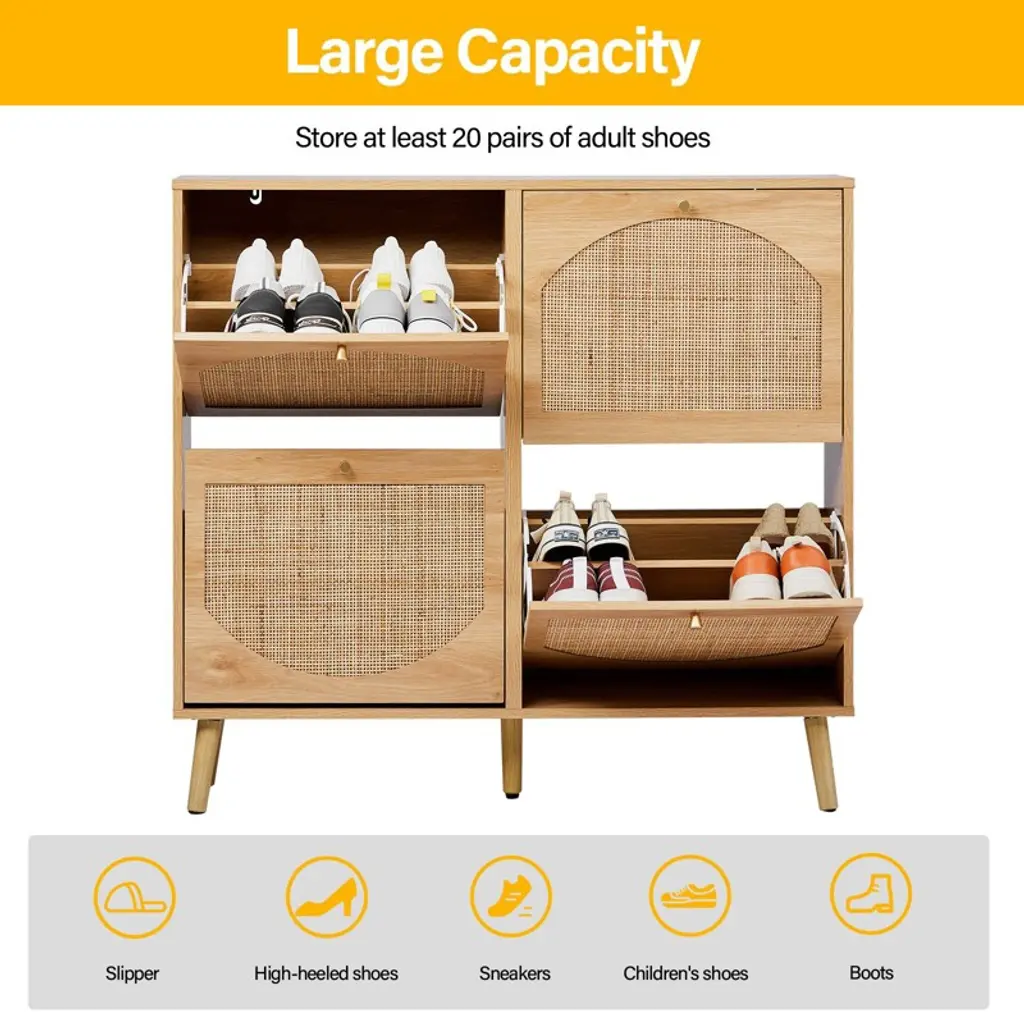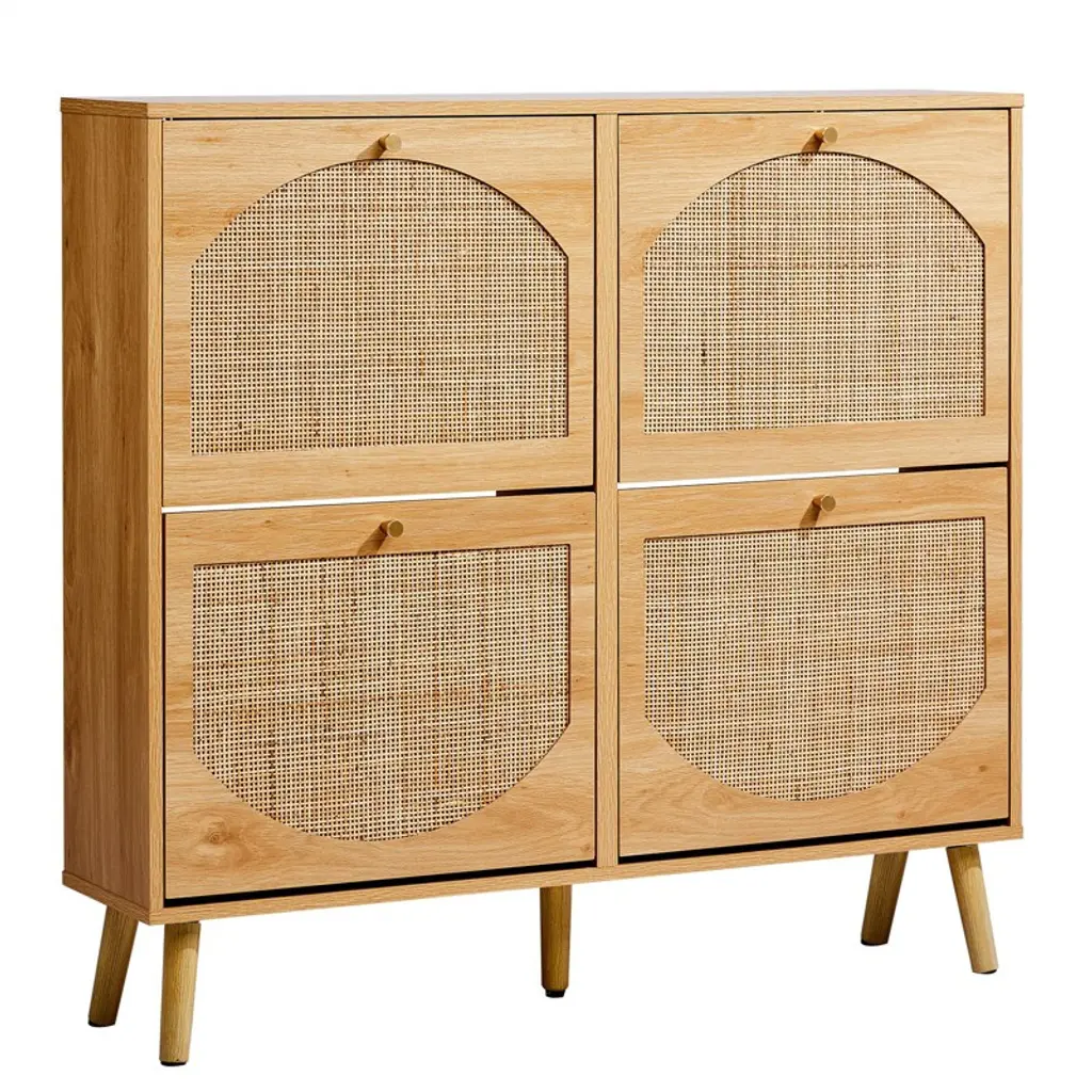 The elegant shoe cabinet with warm rattan which creates a modern and stylish style. Natural rattan skin increases the charm. The golden round handle brings a comfortable grip experience. It features a space-saving design, providing versatile storage and allowing it easier to place in entryways, hallways, living rooms, or bedrooms. It will perfectly keep your room away from the mess. Our double-layer shoe storage cabinet can accommodate a family's shoes. The shoe cabinet can be placed independently with five feet.