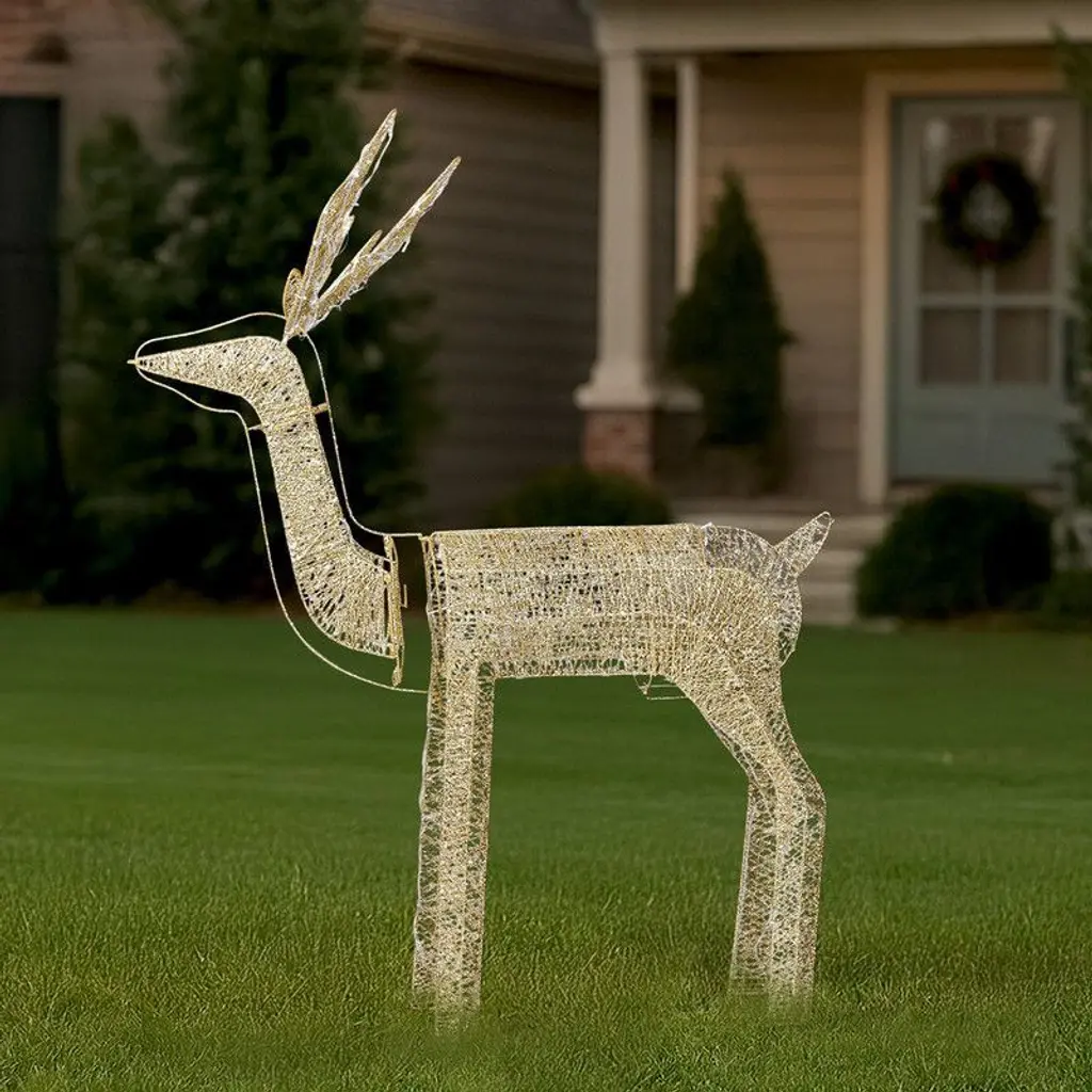 Bring your holiday display to life with this enchanting 3.6ft Golden Motorized Nodding Reindeer! Crafted with a dazzling glitter-sprinkled wire frame, this majestic figure features a built-in motor that creates a charming, lifelike nodding motion. Adorned with 120 warm white LED lights, it radiates a cozy, inviting glow day and night. Designed for effortless magic。 This decoration operates safely at low voltage (30V) with minimal energy consumption (3.6W). Perfect for lawns, porches, or indoors, it adds dynamic wonder to any Christmas scene.