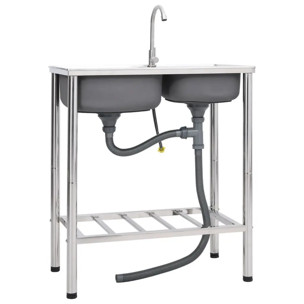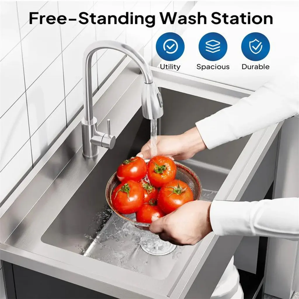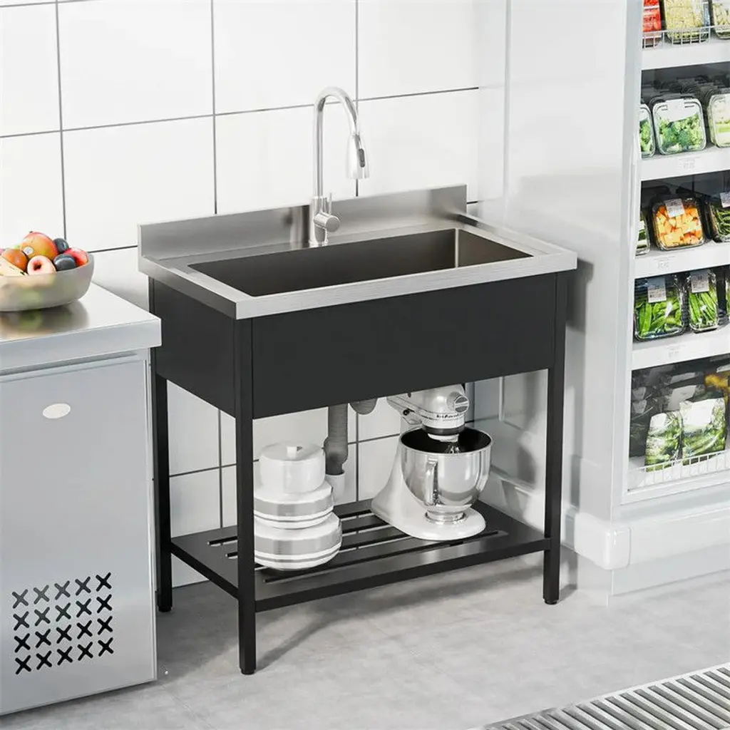 Upgrade your laundry room, kitchen, restaurant, garage, or outdoor garden with the Stainless Steel Utility Sink. Designed for durability and functionality, this free-standing sink measures 20"D x 36"W x 35.5"H, making it perfectly suited for various spaces. Finished in sleek black, it features a built-in faucet and a convenient draining rack, ensuring practicality and ease of use.Whether you're tackling dirty laundry, preparing food, or working on crafts, the robust stainless steel construction ensures resistance to rust and stains, maintaining its pristine condition over time. The included faucet provides ample water flow, while the draining rack helps keep your workspace tidy and efficient.