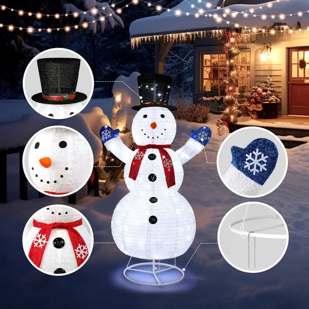 Celebrate the holiday season with this adorable 6ft Lighted Pop-Up Snowman. This large, white outdoor Christmas decoration is perfect for spreading holiday cheer both indoors and outdoors. Made with high-quality materials, our snowman is designed to be durable and long-lasting. Featuring 200 LED lights, including 20 twinkling lights, it adds a magical glow to your lawn, yard, or indoor space. The snowman is dressed up with a hat, scarf, and gloves to create a charming and festive appearance. Easy to install and fold up for storage, you'll love bringing out this delightful snowman year after year.