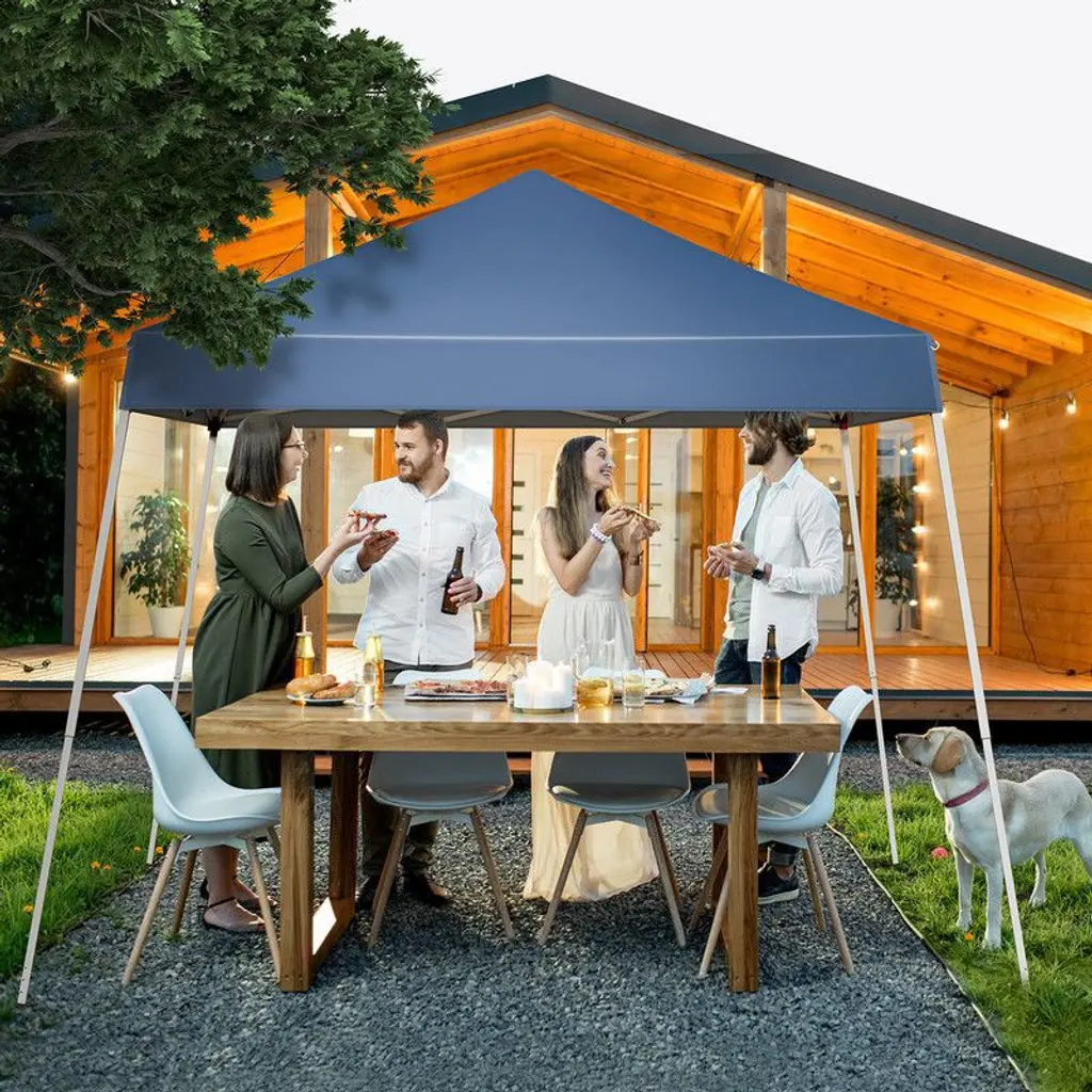 The pop-up canopy is made with white powder coated steel frame & waterproof 210D oxford fabric cover;Blocks 90% of sunlight and provides UV protection,which is suitable for outdoor use in both sunny and rainy days;It is 10 x 10 feet(W x D)in size and can accommodate up to 8 people;It comes with a portable storage bag for easy storage and movement.
