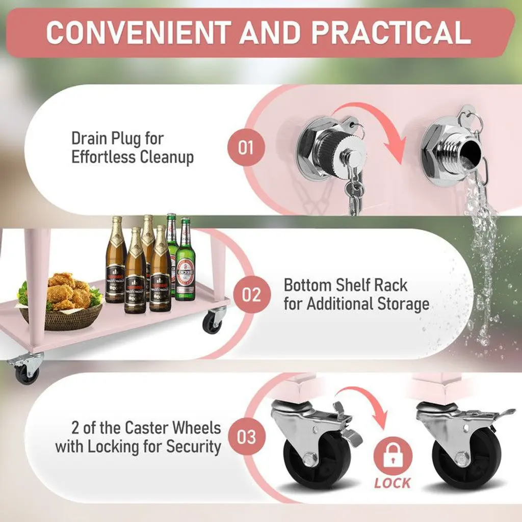 Level up your outdoor events with an all-in-one cooler cart! Fit all the cool refreshments you need with a large, 80-quart fill capacity, and the lower shelf provides extra space for extra beverages or other items you wish to store. Its insulated basin keeps your beverages cold for multiple hours with its injected molded insulation technology. The bottle opener and cap catcher help you easily remove and collect the caps, and the sturdy wheels provide easy mobility when the cooler is full with its locking casters. The drainage cap make it so convenient to clean up the cooler in a nap. Entertain yourself and your guests with this beautiful and high-quality rolling cooler cart!