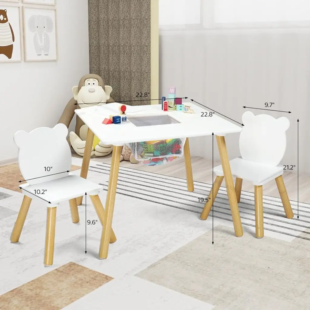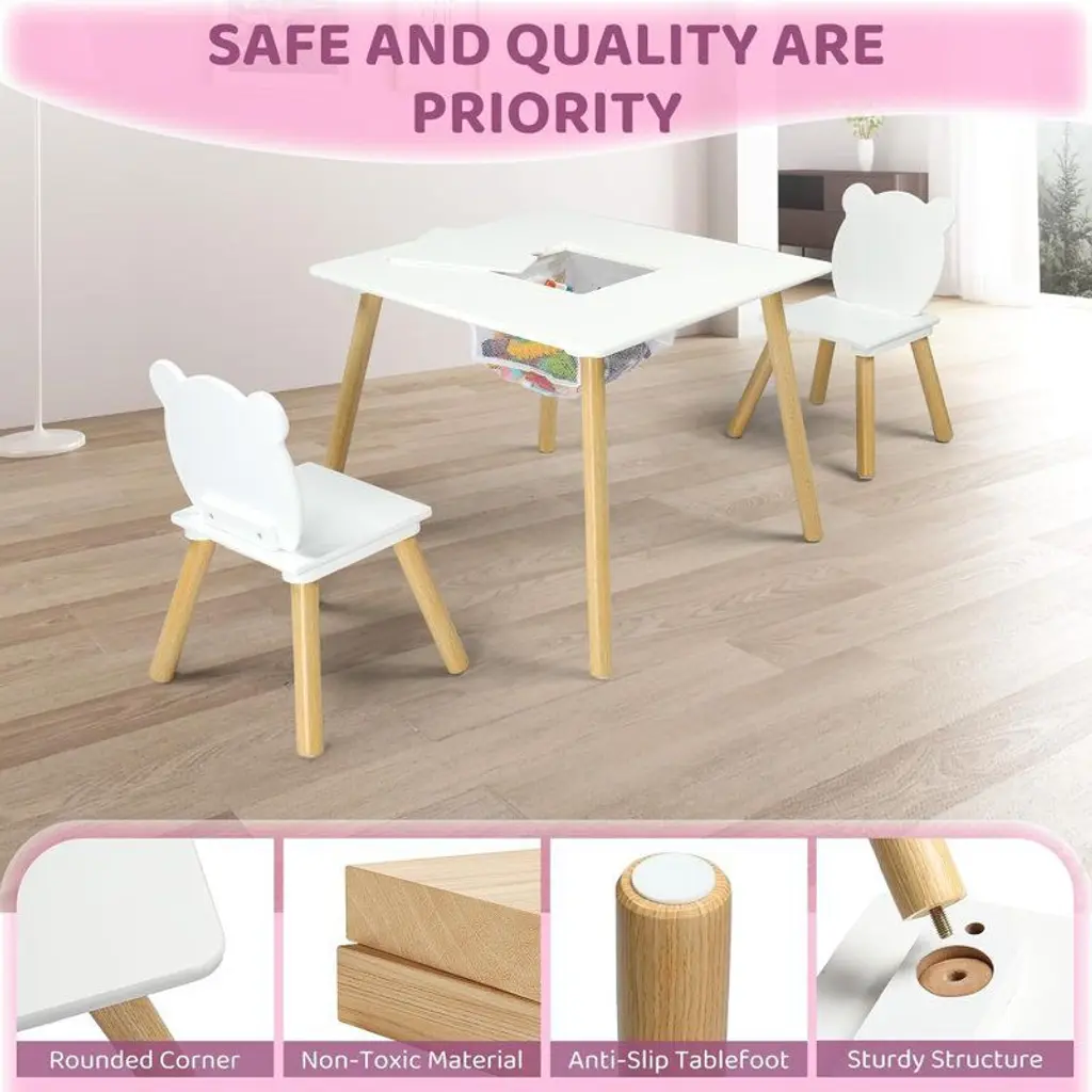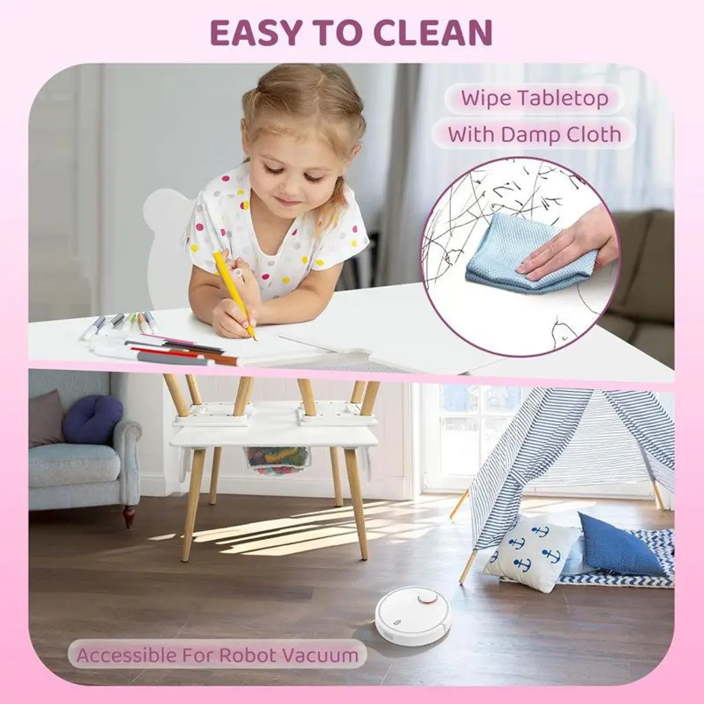 Our charming Kids Table and 2 Chairs Set, an essential addition to any playroom or craft area designed for children aged 2-5. This versatile 3-in-1 activity table is not only aesthetically pleasing but also highly functional, featuring a removable tabletop that allows for flexible use in various activities. The set includes two adorable panda ear chairs, which are as comfortable as they are cute, providing a safe and cozy seating option for your little ones.The storage compartment beneath the tabletop offers a convenient solution for keeping toys, crafts, and learning materials organized and within easy reach. Made from high-quality, child-safe materials, this set is durable enough to withstand the daily wear and tear of active toddlers. It's the perfect blend of fun and functionality, encouraging creativity and independent play while ensuring that cleanup is a breeze. Ideal for home, classroom, or daycare settings, this kids' table and chair set will be a beloved feature in any space dedicated to young children.