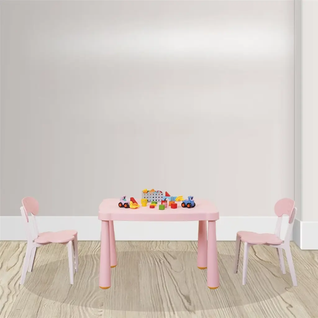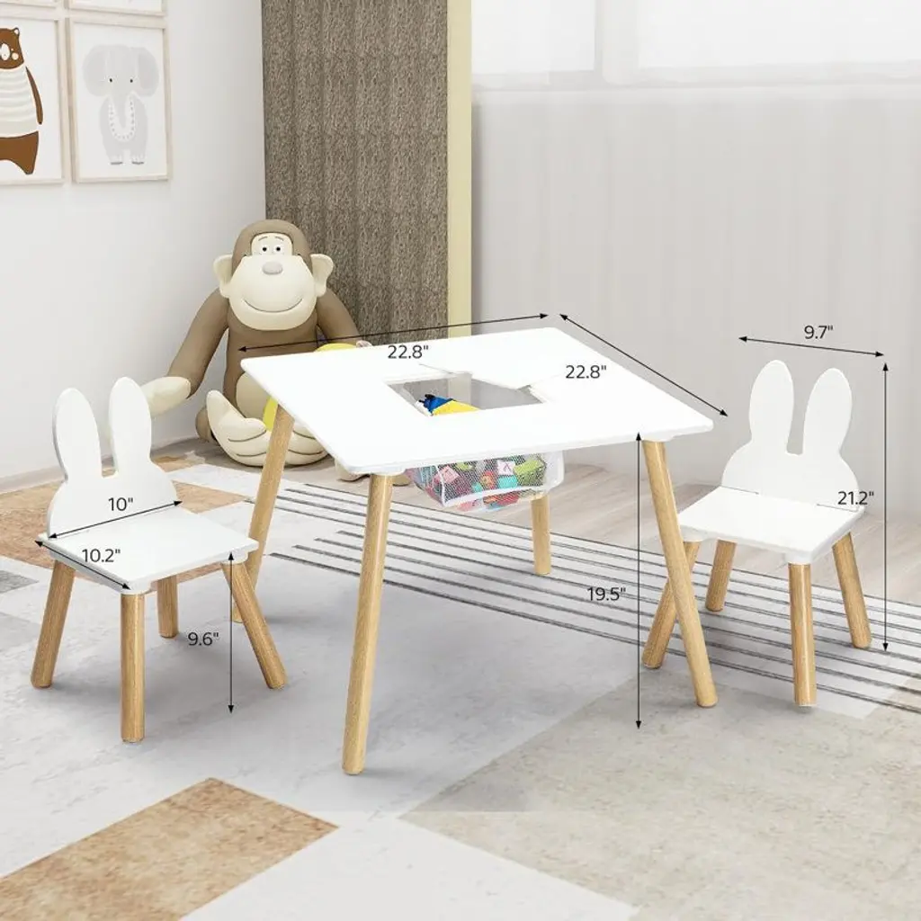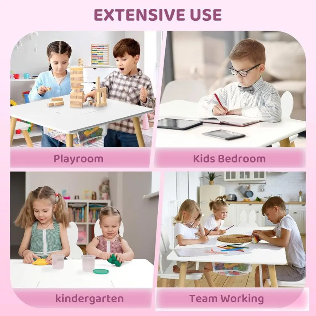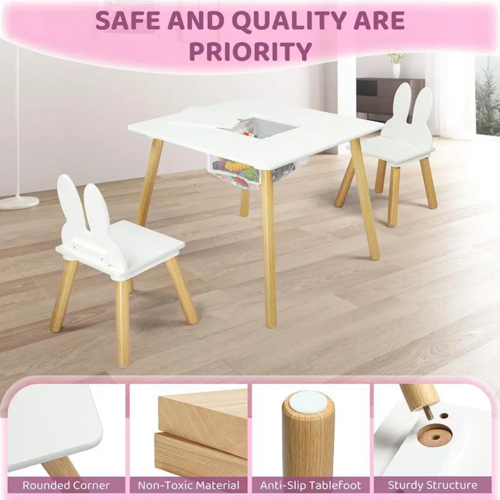 Our charming Kids Table and 2 Chairs Set, an essential addition to any playroom or craft area designed for children aged 2-5. This versatile 3-in-1 activity table is not only aesthetically pleasing but also highly functional, featuring a removable tabletop that allows for flexible use in various activities. The set includes two adorable panda ear chairs, which are as comfortable as they are cute, providing a safe and cozy seating option for your little ones.The storage compartment beneath the tabletop offers a convenient solution for keeping toys, crafts, and learning materials organized and within easy reach. Made from high-quality, child-safe materials, this set is durable enough to withstand the daily wear and tear of active toddlers. It's the perfect blend of fun and functionality, encouraging creativity and independent play while ensuring that cleanup is a breeze. Ideal for home, classroom, or daycare settings, this kids' table and chair set will be a beloved feature in any space dedicated to young children.