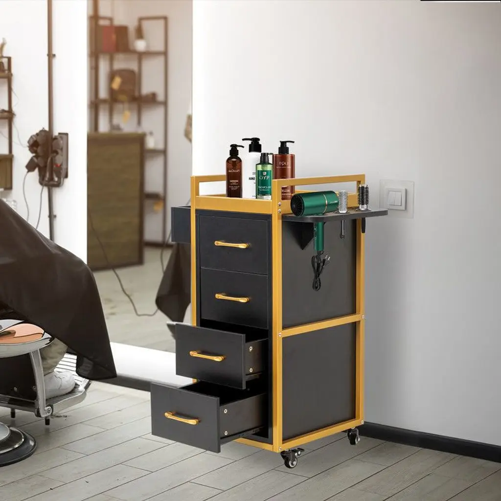 Salon trolley cart combines a sleek black and gold color scheme with a modern aesthetic, enhancing the elegance of any workspace. Its golden handle and borders add a luxurious touch, perfect for salons and beauty studios.