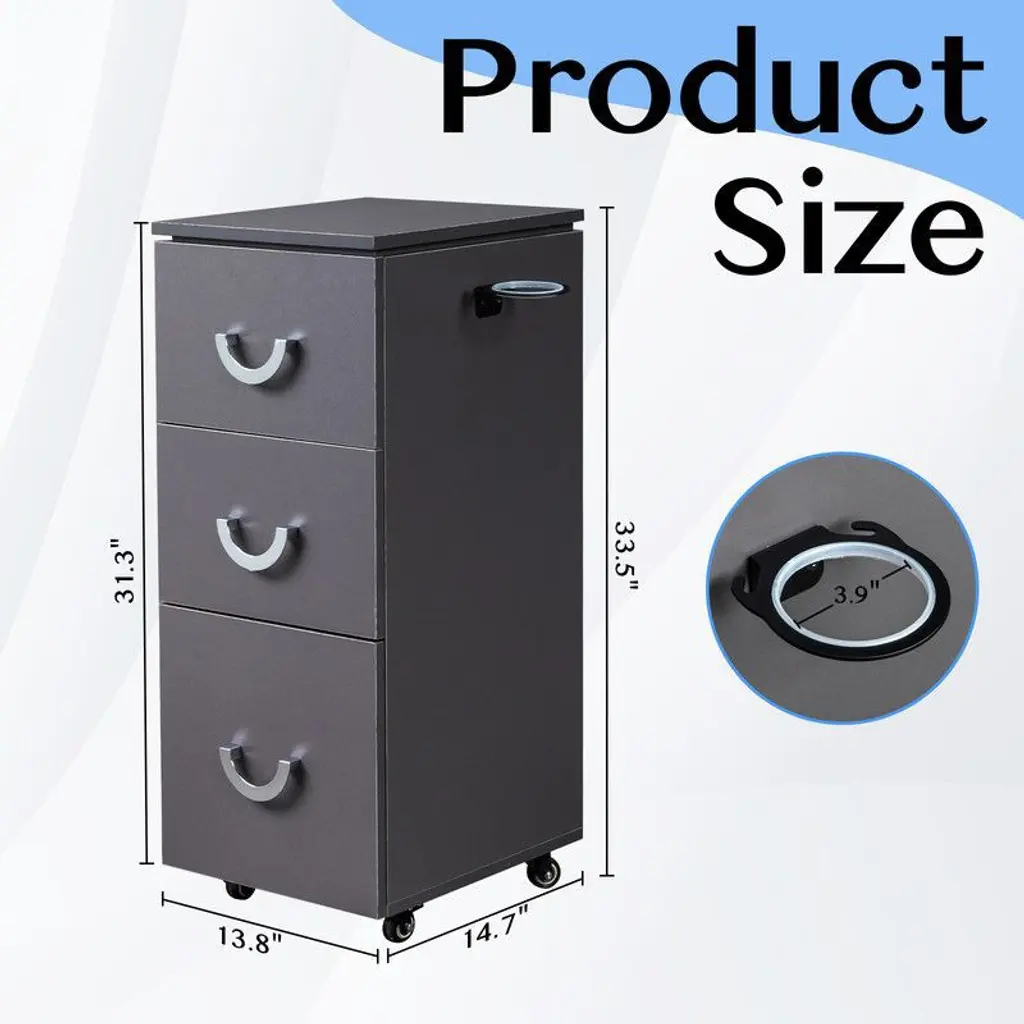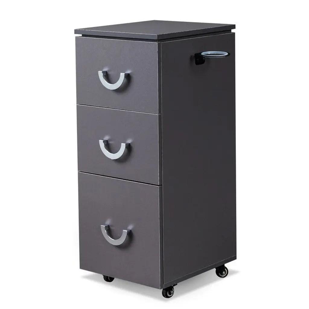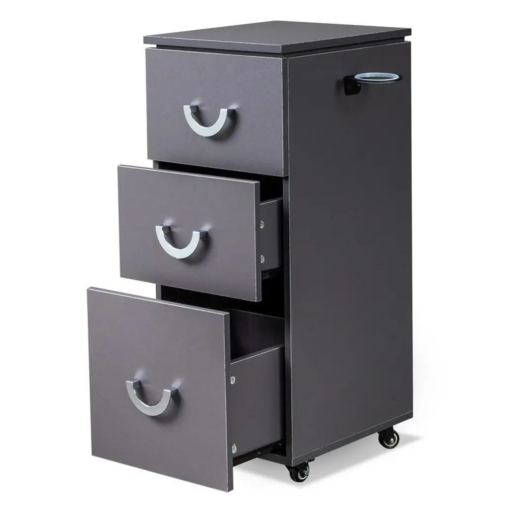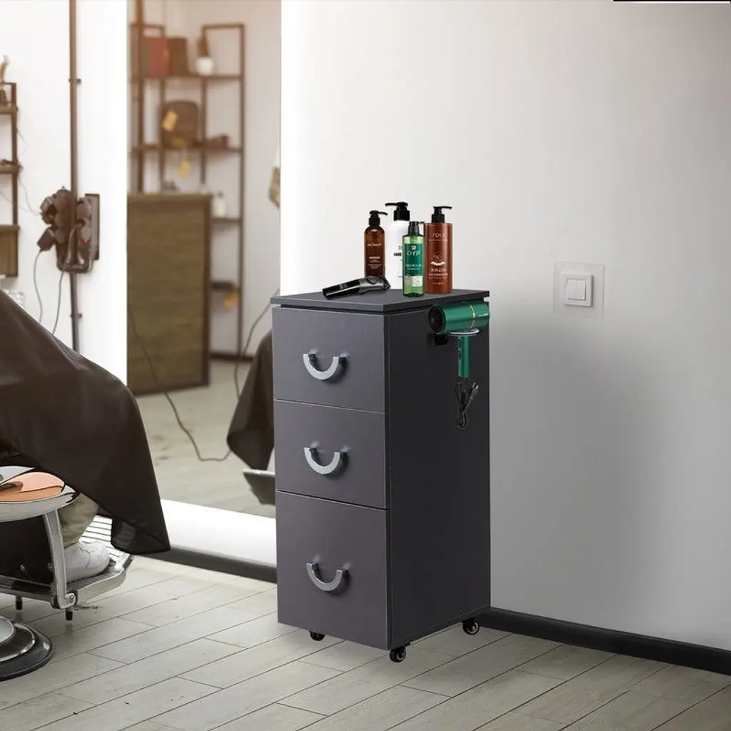 Salon Trolley Cart is a must-have mobile storage solution for hair stylists, beauty spas, and barbershops. Designed with 3 spacious drawers and a side tool holder, this rolling cart offers ample storage for all your styling tools and accessories. Its durable engineered wood construction ensures long-lasting performance, while the 360° wheels with locking mechanisms provide easy mobility and stability. The sleek dark grey design complements any salon decor, and the ergonomic handle makes it easy to maneuver. Perfect for keeping your workspace organized and efficient.