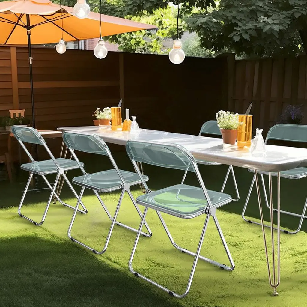 A set of 2, modern-style acrylic chairs with a stainless steel frame ensures the durability and load-bearing capacity of the chairs, and a single chair can hold up to 350 pounds.